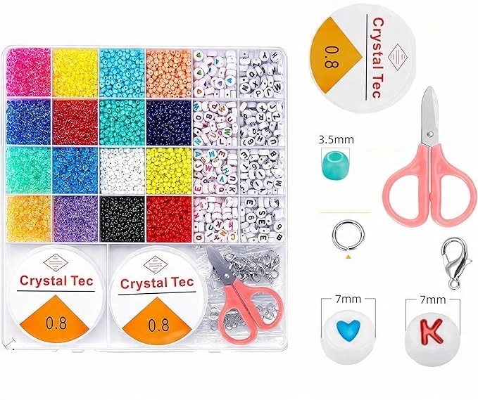 - Наборі включає: 8000 х 16 барвисті міні -намистини 3,5 мм; 200 х в капітальних листах; 150 х кольорових літер; 50 x серця -бісер; 2 х гнучка струна 0,8 мм; 20 х пряжок; 50 х пружинні кільця; 1 х міні -ножиці; 1 x Коробка організаторів. Легко переносити та зберігати.