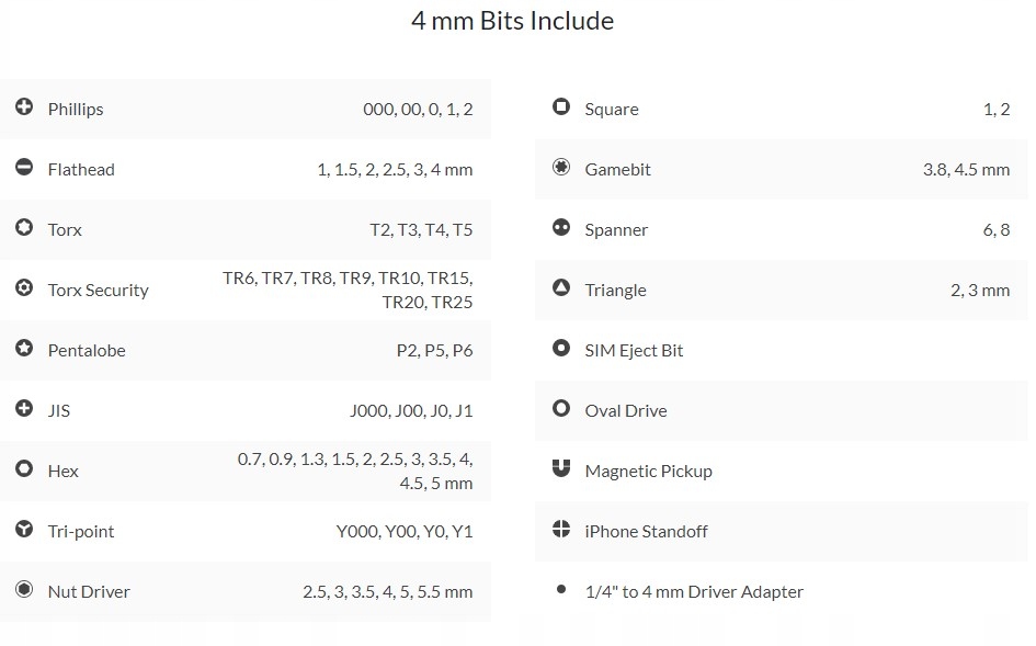 - Алленні біти - 0,7, 0,9, 1,3, 1,5, 2, 2,5, 3, 3,5, 4, 4,5, 5 мм