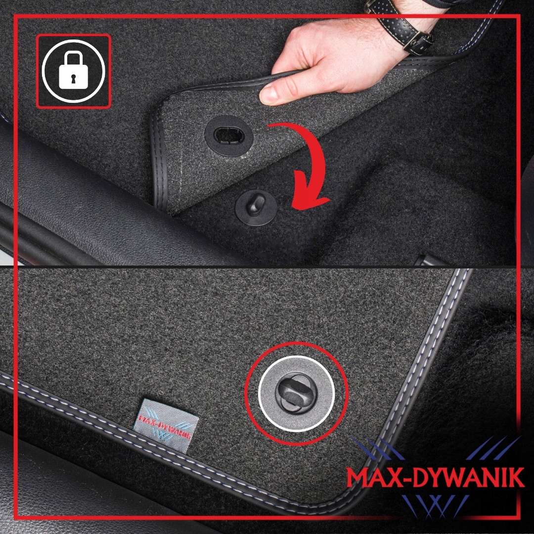 Кріплення автомобільного килимка складається з двох частин: одна частина кріпиться до килимка зверху, а інша кріпиться до килимка знизу, кріплячи килимок. Кріплення призначені для фабричних шпильок з поворотною пряжкою на 90 градусів, т.зв. овальні кріплення.