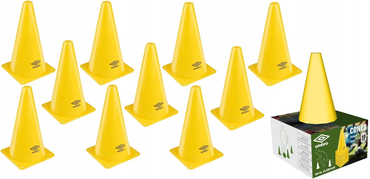 НАБІР ТРЕНУВАЛЬНИХ КОНУСІВ ВИСОТОЮ 23,5СМ 10ШТ UMBRO ідеально підійде для всіх видів тренувань. Розміщені на полі, вони дозволяють слаломувати з м’ячем, навчають передачі м’яча під час гри та спритності на полі.