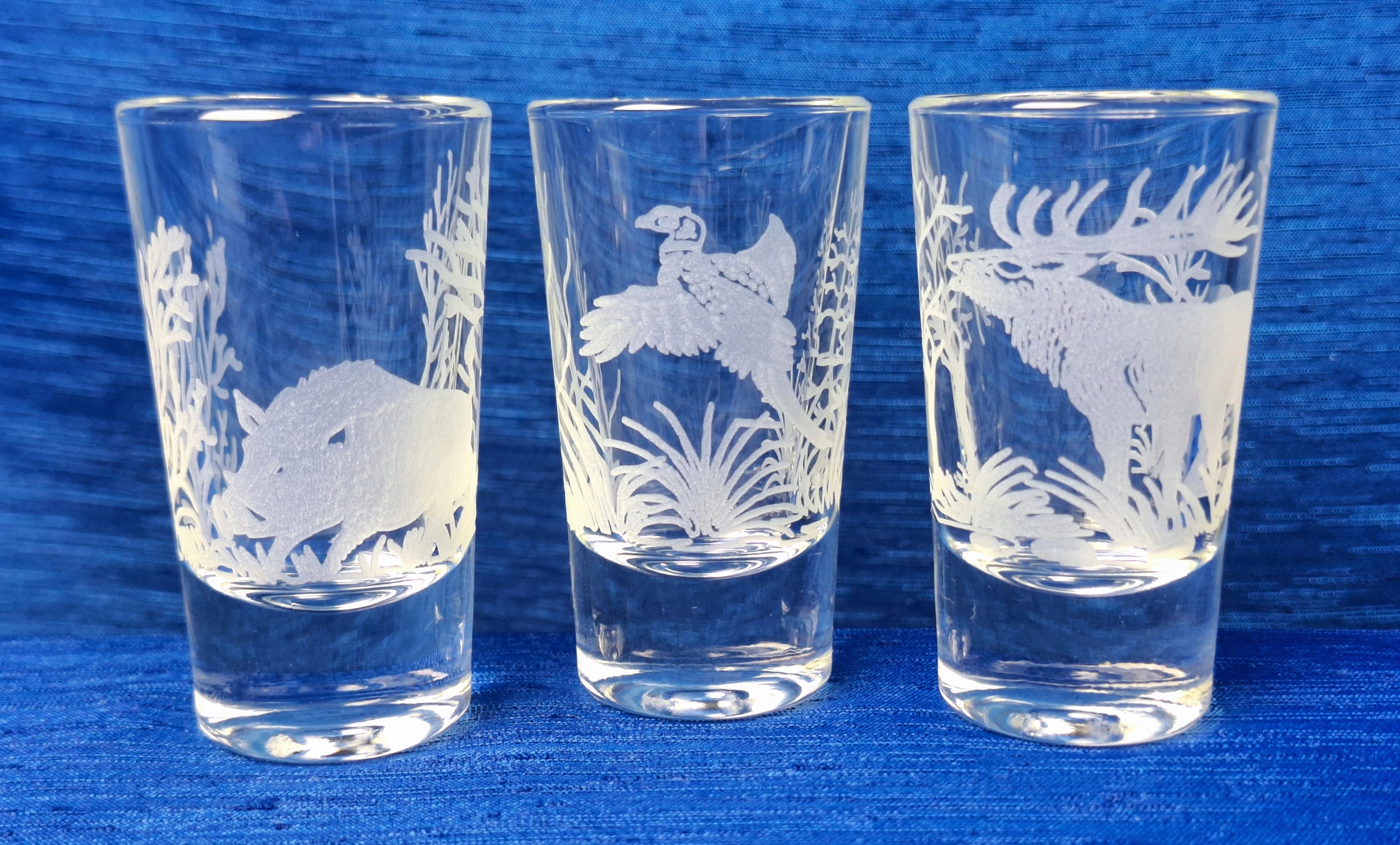 Скло прикрашене мотивом полювання. У набір входить 18 склянок, прикрашених 6 різними візерунками тварин.