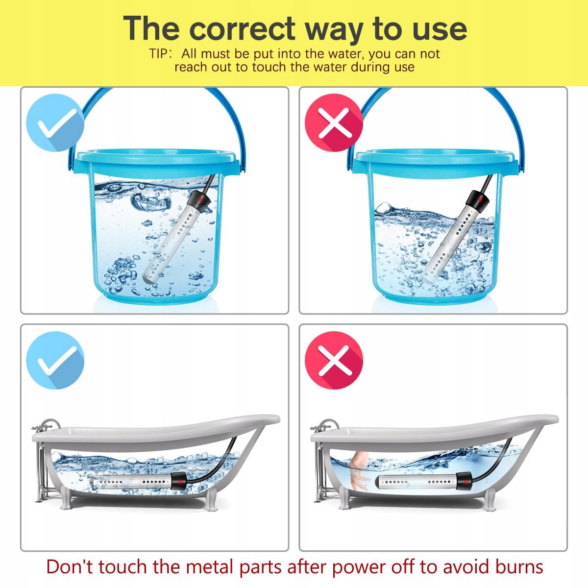 Високоякісний і безпечний занурювальний водонагрівач має високоякісну захисну кришку з нержавіючої сталі, яка може ефективно запобігати безпосередньому контакту нагрівального елемента з людьми чи тваринами.