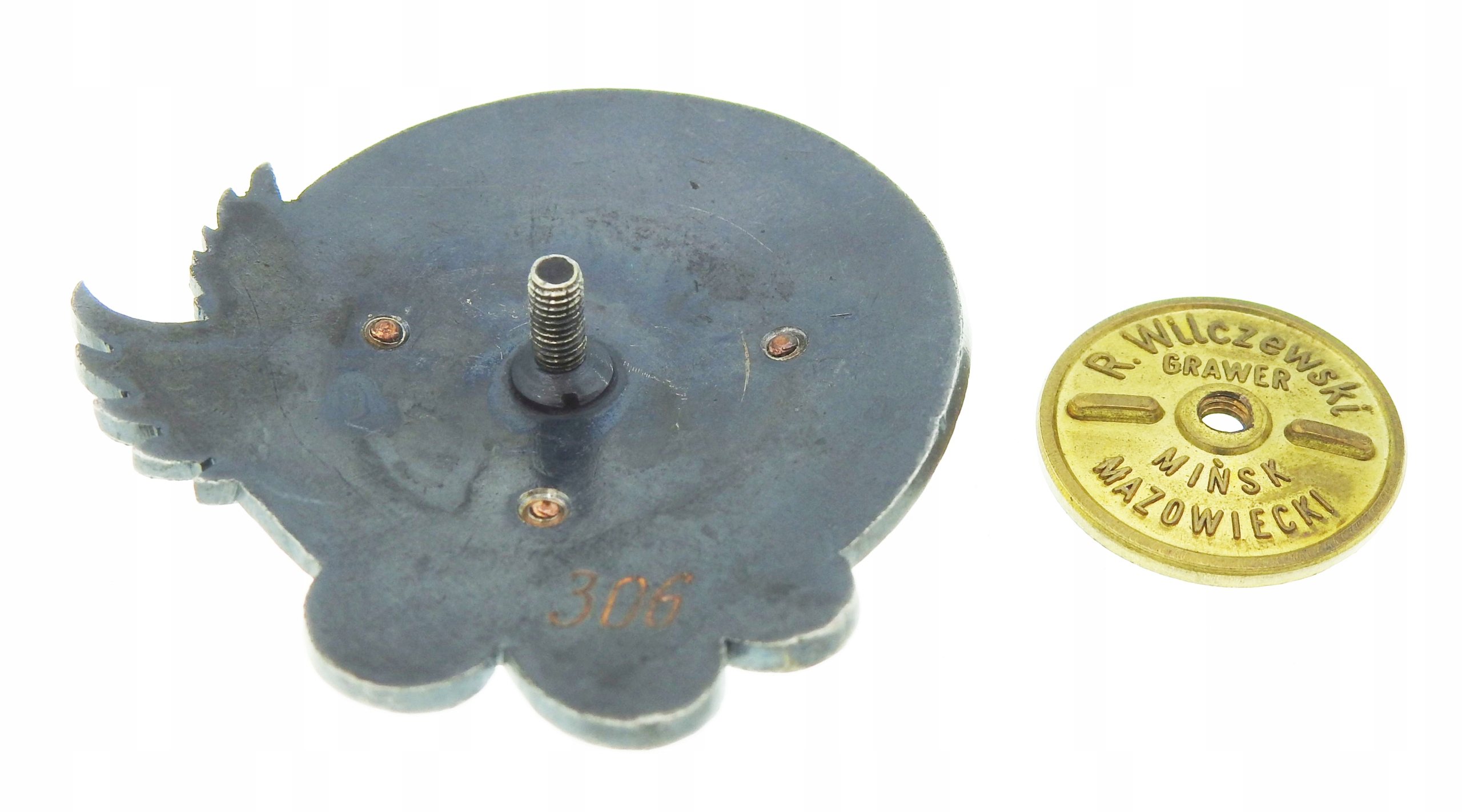 значок розміром ~46 x 45 мм, 2-компонентний, емальований, кріплення на різьбовий штифт, гайка діаметром ~20 мм, підписаний написом «Wilczewski Mińsk Maz». , б/в, стан як на фото, оригінал