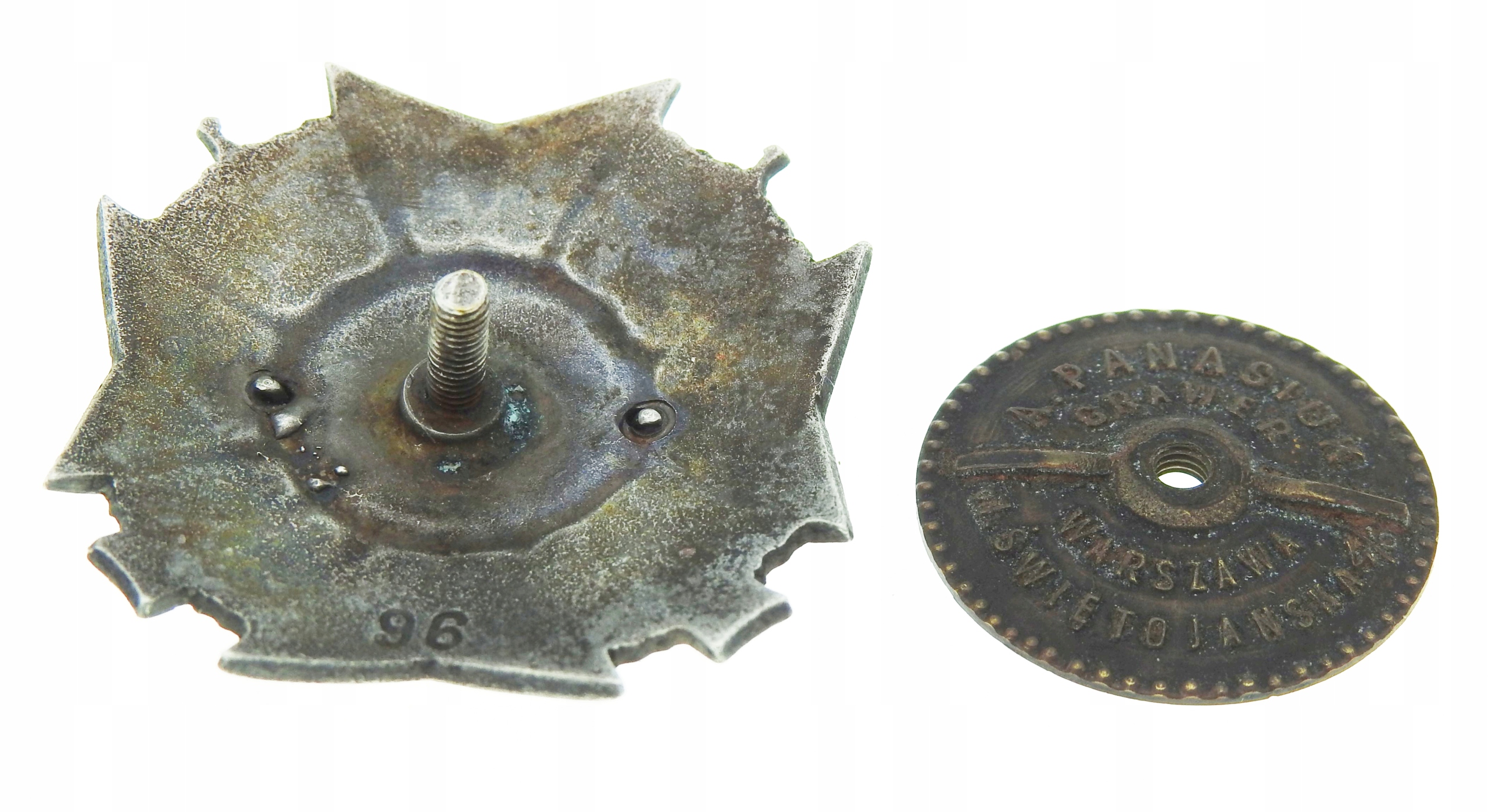 нагрудний знак, розміри ~39 х 39 мм, 3 частини, емальований, різьбовий штифт, гайка діаметром ~26 мм, підписана надписом "Panasiuk Warszawa", б/у, стан як на фото, оригінал