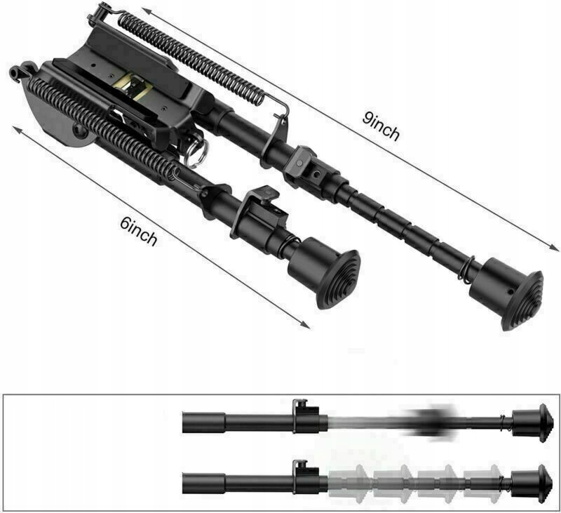 - Ноги з 5-ногами можна відрегулювати в діапазоні від 6 до 9 дюймів, щоб ви могли знайти комфортну висоту для прицілювання. Стабільність гвинтівки в різних умовах завдяки гумовому майданчику