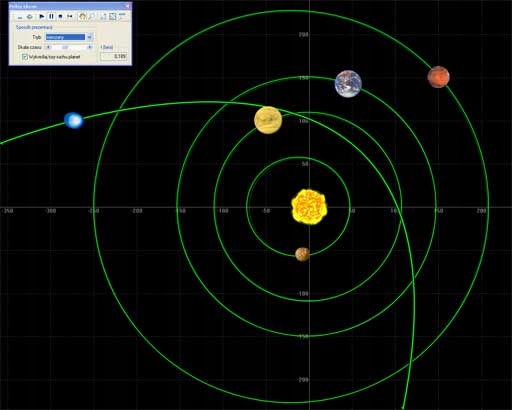і так в силі тяжіння, напр. У тяжкості ви можете експериментувати з будь -якими небесними тілами: зірками, планетами, кометами, космічним кораблем або чорними отворами в імітованому гравітаційному полі. Ви також можете завантажити всю Сонячну систему 1 січня 2000 року з файлу. Іншим прикладом є тісне розташування зірки та масивна планета, що спричиняє характерне коливання зірки, завдяки якому сьогодні виявляються позасолярні планети.