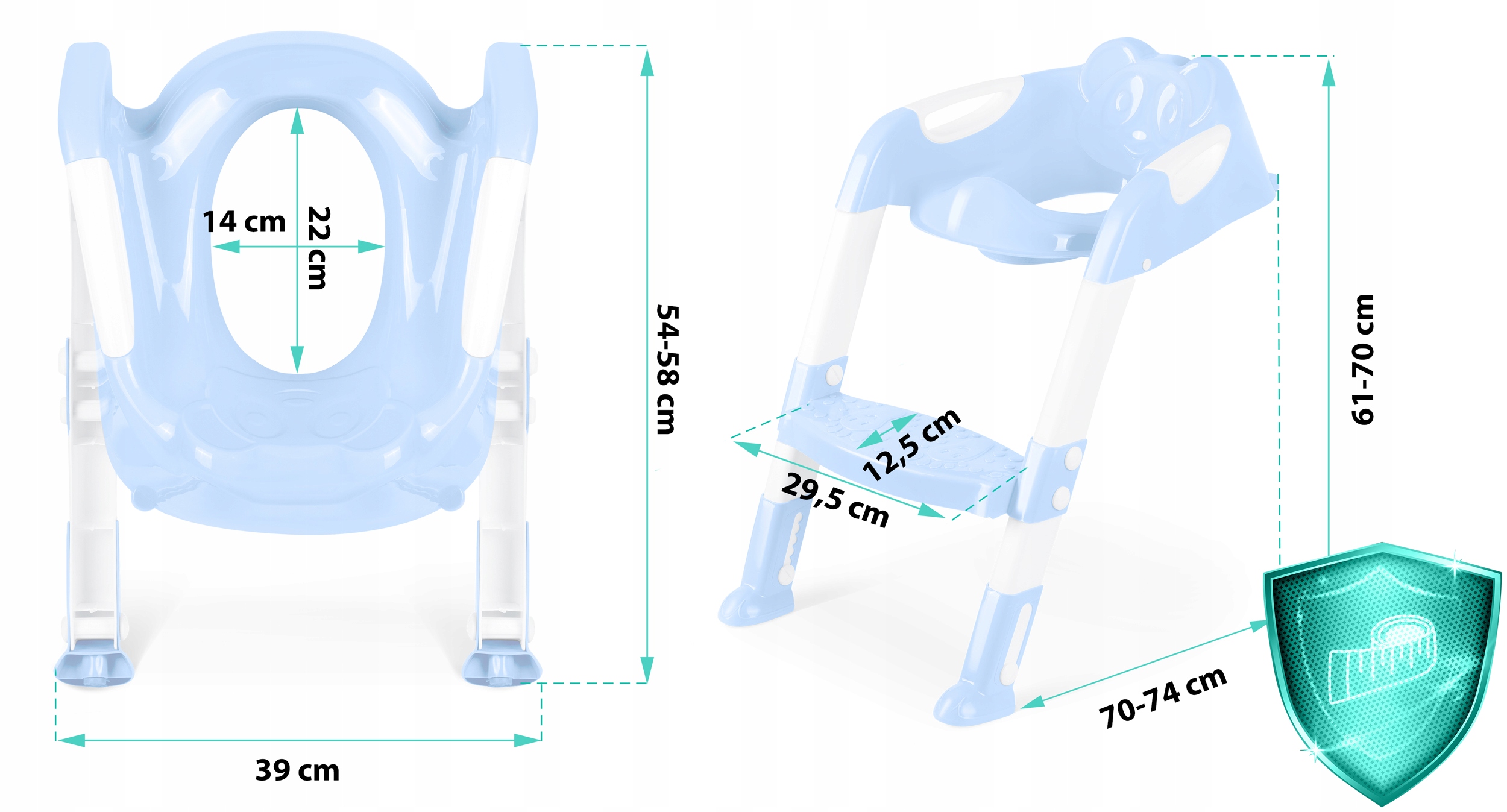 - Завдяки ергономічному дизайну воно зручно та адаптується до форми хребта дитини, а його висота регулюється, тому підходить практично до всіх моделей сидінь для унітазів.