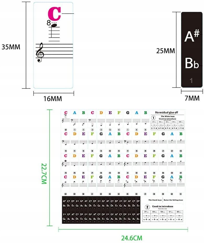 Музей: 24,60 x 22,70 x 0 , 10 см. Життя барвисті наклейки, щоб полегшити запам'ятовування: наклейки в яскравих кольорах, що полегшує користувачам запам'ятовувати фортепіанні клавіатури. і клавіатури. : Наклейки можна легко застосувати та вилучити з фортепіанних клавіатур, не завдаючи шкоди.