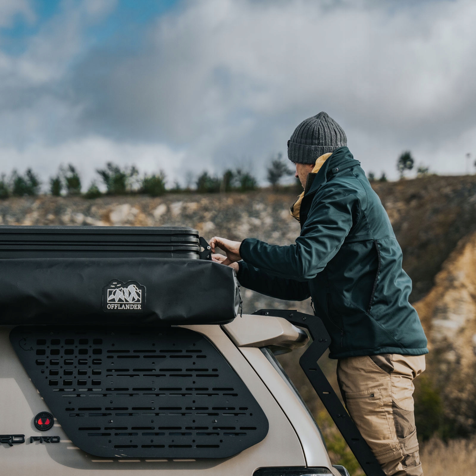 Це рішення дає нескінченні можливості під час поїздки. Крім того, під час механічного пошкодження одного з компонентів намету він дозволяє швидко замінити кріплення, привід або шарнір.