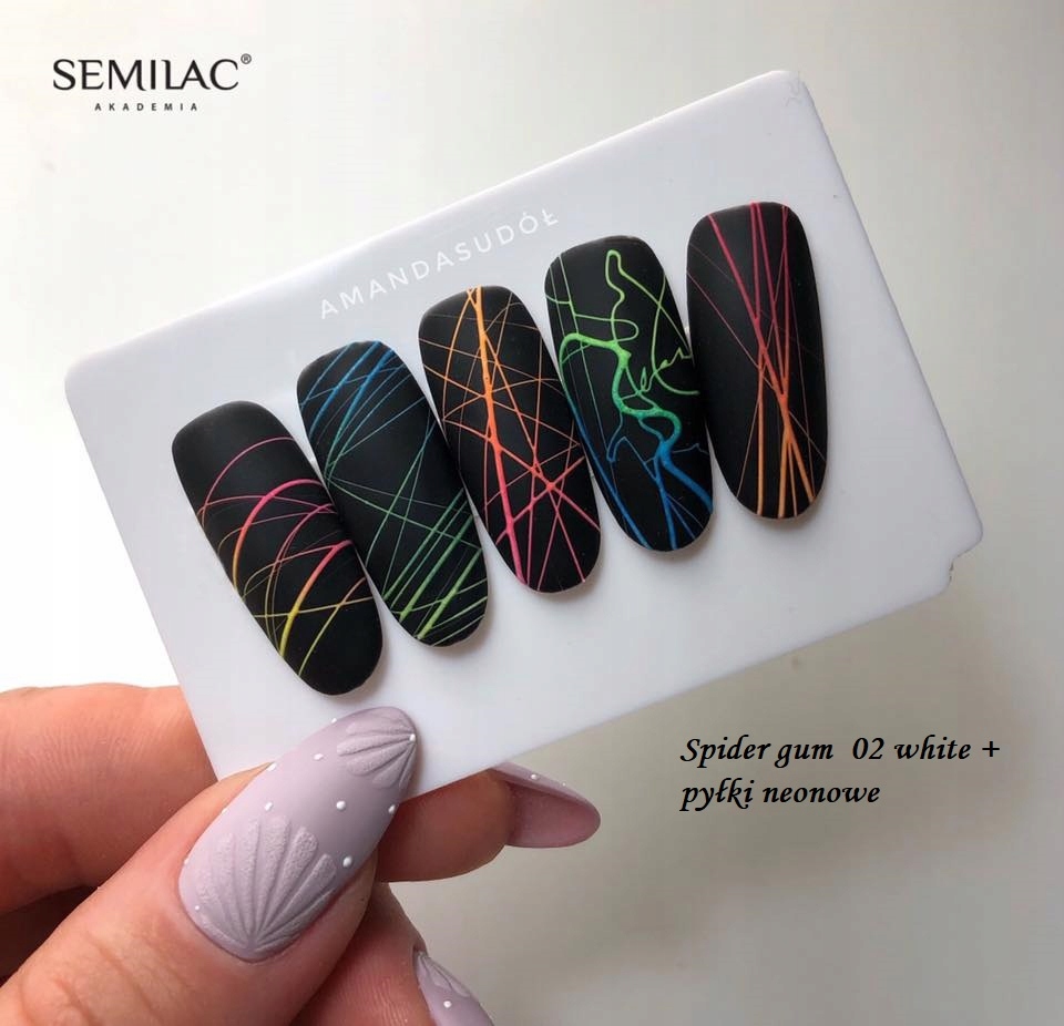 Використання: Продукт наноситься на цвях за допомогою дерев’яної палички, щітки або спеціальних зондів з крапковим інструментом. Пеп -павука -павука можна наносити на гібридний лак, УФ -гель або акрил. Різні кольори цього незвичайного гелю поєднуються разом, створюють цікаві кольорові поєднання та нескінченно багато ідей для ідеальних прикрас. Гель для прикрас можна наносити двома способами: під верхнім шаром і вгорі.