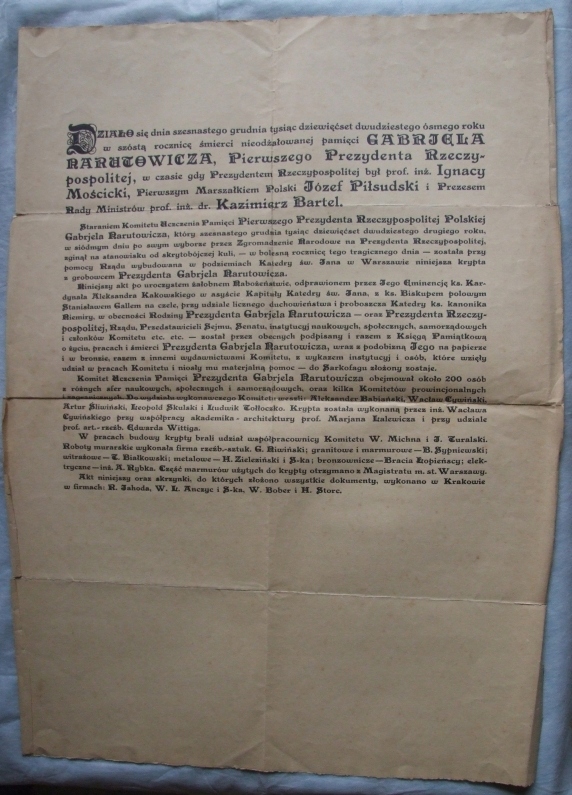 Narutowicz Dokument z krypty oryginalna kopia 1928