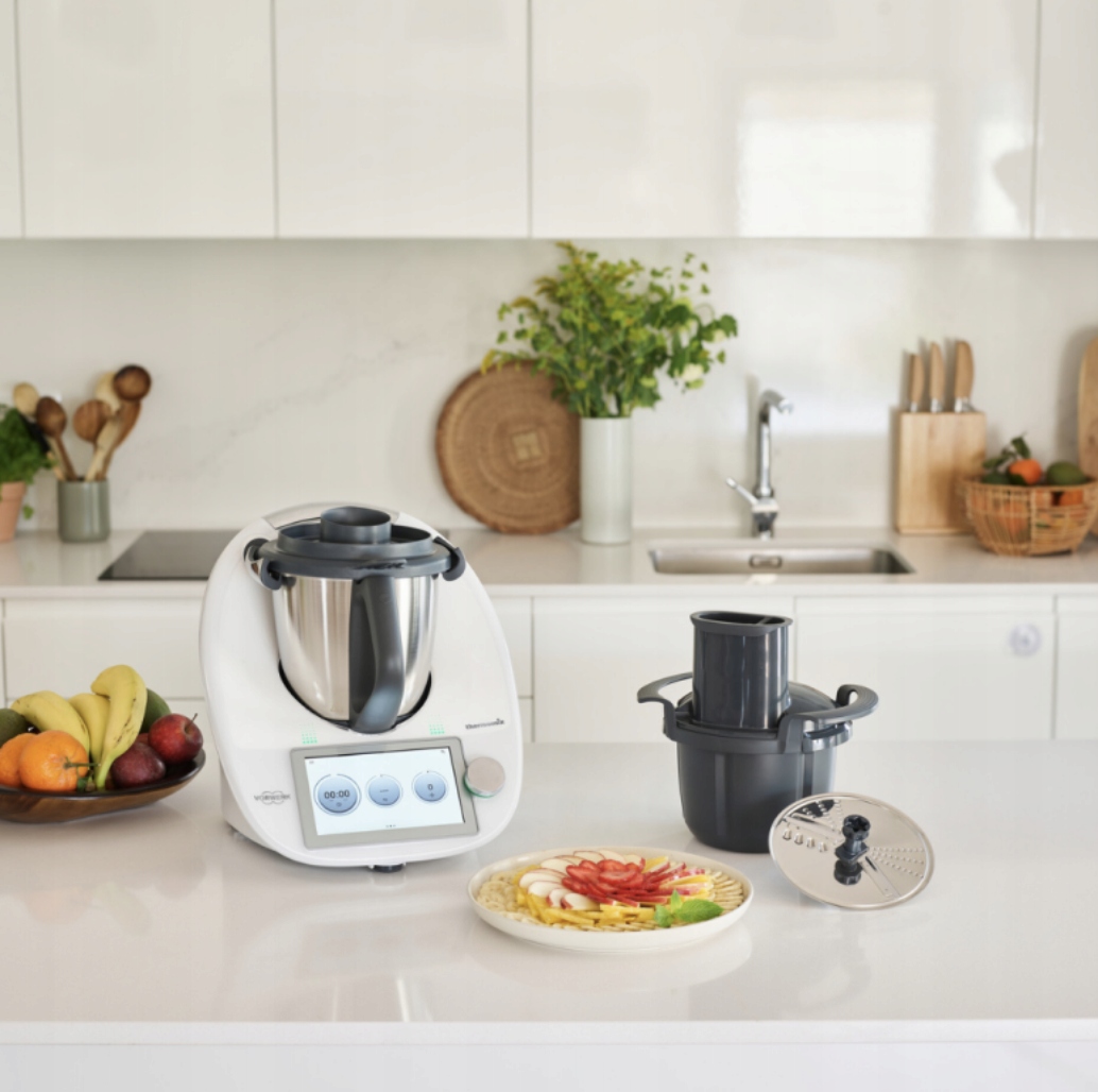 Ріжуча насадка Thermomix дозволяє швидко й легко нарізати фрукти й овочі, заощаджуючи час і усуваючи зусилля, пов’язані з нарізанням інгредієнтів вручну. Тепер ви можете нарізати необхідні інгредієнти швидше та простіше естетично. Ріжуча насадка Thermomix маєнадзвичайно гострі леза, які забезпечують точне нарізання інгредієнтів наскибочки та смужки. Його можна використовувати в пристроях Thermomix TM6 і TM5.