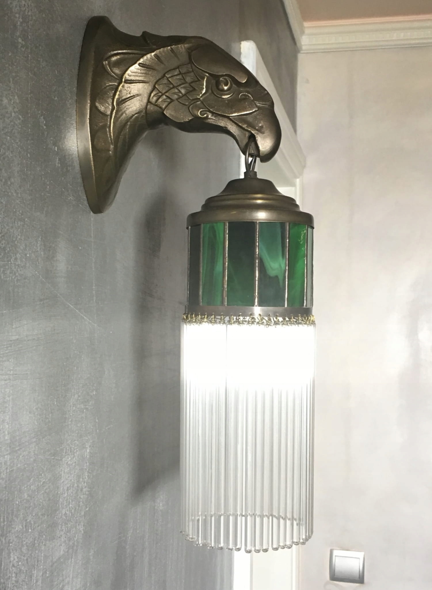 Цей настінний світильник у стилі арт-деко поєднує в собі строгість форми та надзвичайну вишуканість самої концепції. Неодмінно стане ідеальним елементом декору в класичній та еклектичній атмосфері. На ній зображена голова орла, який тримає в дзьобі ліхтар. Орел був виготовлений із латуні мідного кольору з позолотою.