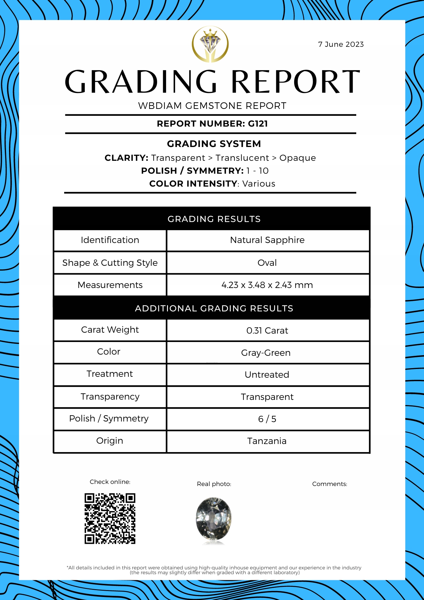 Сертифіковано WBDIAM - ЗВІТ №: G121 - сертифікат надається в цифровій формі (PDF )
