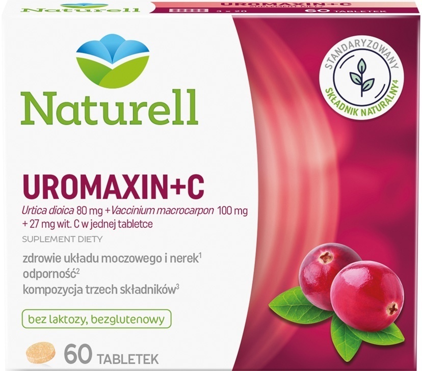 Підготовка Naturell Uromaxin + C включає екстракт фруктів з великим фруктом, стандартизований до вмісту 12% проантоціанідину (PAC), звички звичайної трав’янистої трави та вітаміну С.