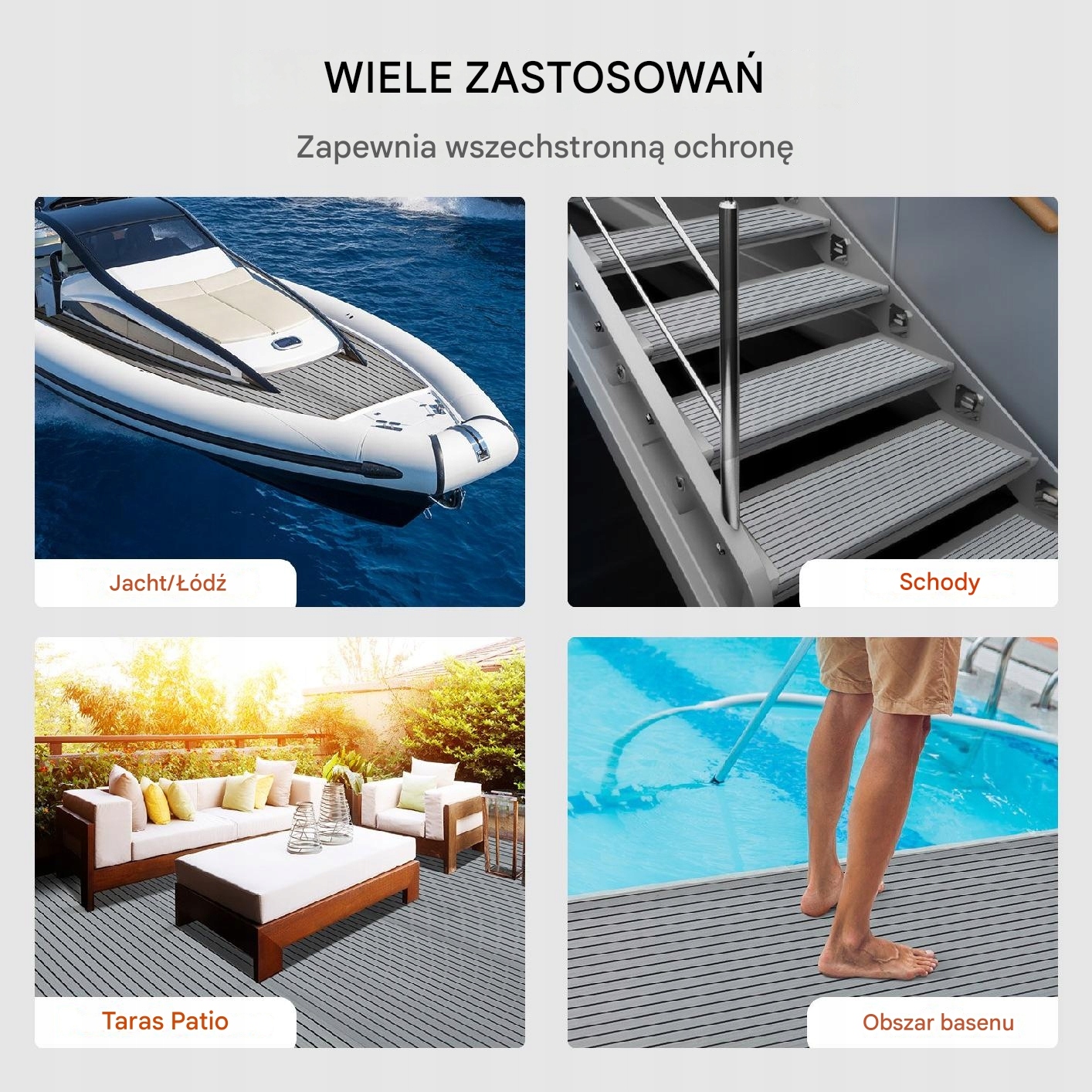 Один пінопласт EVA на дошці подає багато цілей, що охоплює площу до 2,78 м². Захищає човни, сходові, спортзали, басейни та багато інших місць.