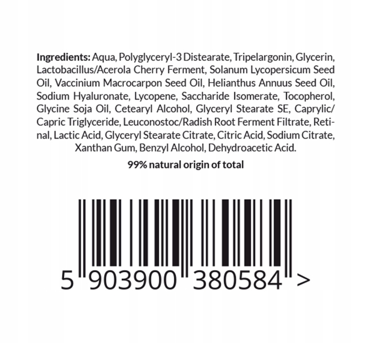 Aqua, Polyglyceryl-3 Distearate, Tripelargonin, Cetearyl Alcohol, Glycerin, Glyceryl Stearate SE, Lactobacillus/Acerola Cherry Ferment, Solanum Lycopersicum Seed Oil , олія насіння Vaccinium Macrocarpon, олія насіння Helianthus Annuus, гіалуронат натрію, лікопін, ізомерат сахариду, токоферол, гліцин, соєва олія, ретиналь, каприловий/каприновий тригліцерид, фільтрат кореня лейконостоку/редьки, гліцерилстеарат цитрат, лимонна кислота, цитрат натрію, ксантан Камедь, бензиловий спирт, дегідрооцтова кислота