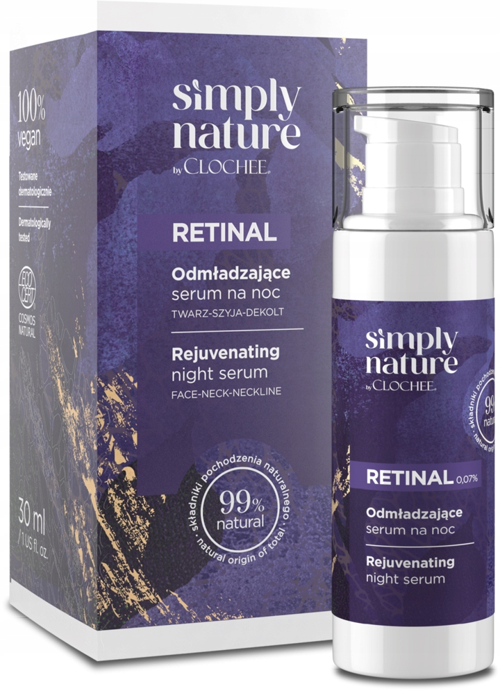 Ретиноїди стають все більш популярними в догляді за шкірою. У цьому немає нічого дивного. Це група речовин, які є похідними вітаміну А, які відрізняються своєю ефективною дією в області косметології, а також в дерматології. Вони використовуються в антивікових доглядах, а також для лікування акне. Омолоджуюча нічна сироватка лінії Simply Nature від Clochee використовує один тип ретиноїдів - ретиналь. Сироватка активізує вироблення підтримуючих білків шкіри, тим самим потовщуючи її та покращуючи еластичність.