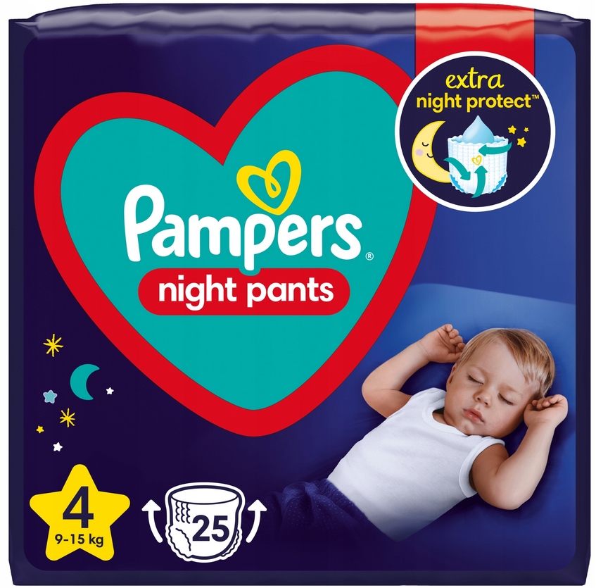 Підгузки Pampers Night Pants гарантують додатковий повний захист від протікання протягом до 12 годин, забезпечуючи вашій дитині міцний нічний сон. Це тому, що вони тепер мають унікальну кишеню Stop & Protect, яка допомагає запобігти протіканню в задній частині, і порівняно з підгузками Pampers Pants вони містять посилену вставку, яка краще вбирає вологу. Підгузки Pampers Night Pants також мають індикатор вологості, який повідомляє, коли їх потрібно змінити. Вони схвалені дерматологами Альянсу здоров’я шкіри та не містять ароматичних алергенів, класифікованих ЄС (відповідно до Регламенту (ЄС) № 1223/2009 Європейського парламенту та Ради щодо косметичних продуктів.