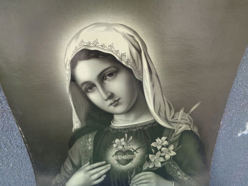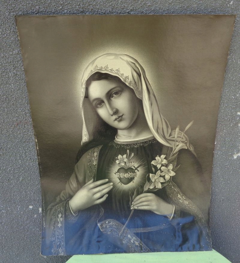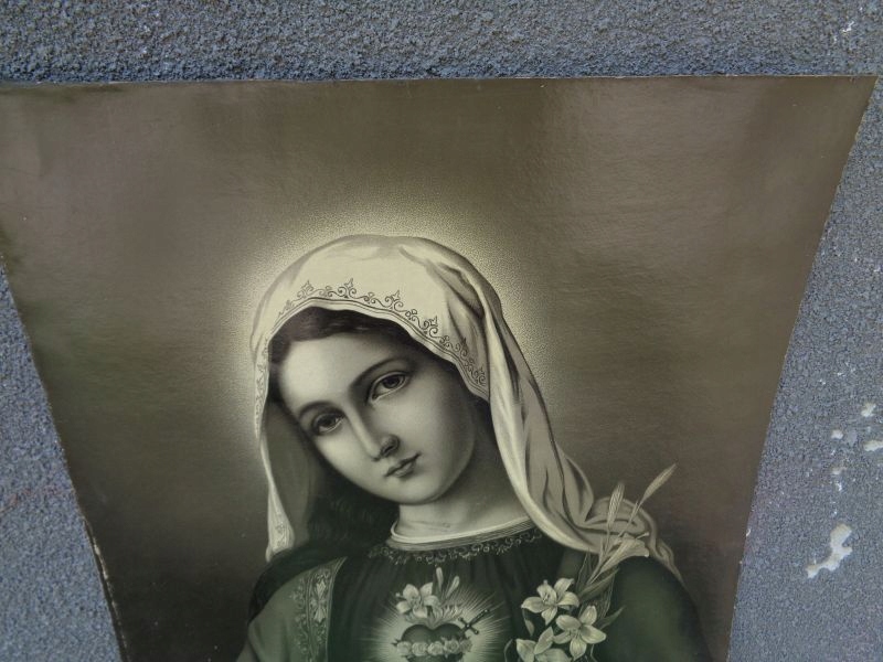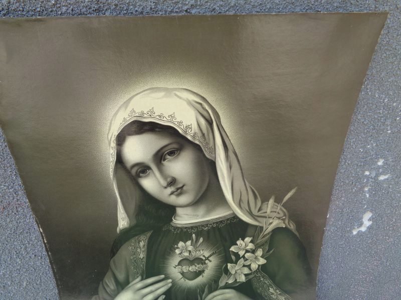 Цікавий, цікавий трафарет 1900-1920 років. На трафареті зображено Діву Марію з палаючим серцем, яка тримає в руці оливкову гілку. Все виконано в красивих приглушених кольорах. Зображення зроблено з увагою до деталей. Рекомендую всім.