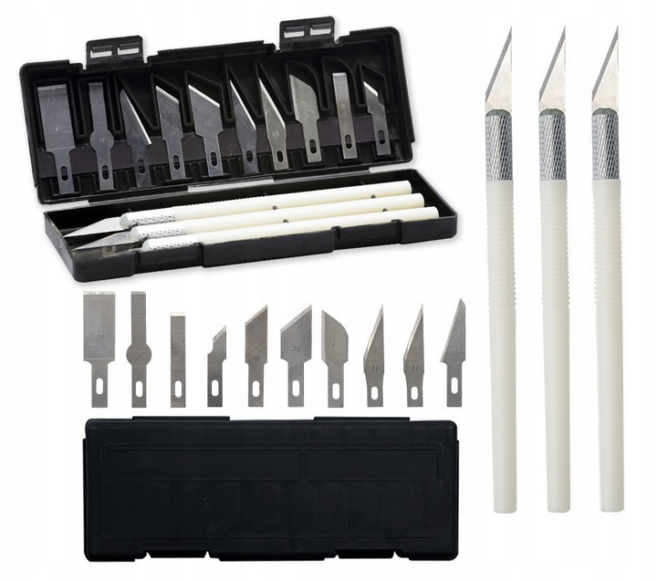 У набір входять три ручки, які зручно тримати за будь-який з 13 можна встановити леза. Широкий вибір форм і розмірів лез дозволить вам підібрати інструмент до конкретного завдання.