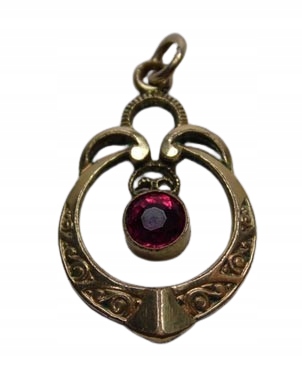 ДЕЛІКАТНА АНТИКВАРНА ПІДВІСКА, ПРИКРАСА З КАМІНЮ РУБІН. Кулон позолочений - позолота. Розміри прикраси 1,21 х 2,08 сантиметра. Загальна довжина з підвісною ручкою 2,35 см. (підвіска на ланцюжку) Камінь рубіново-фіолетового кольору діаметром 3,9 мм. Ювелірні вироби, виготовлені приблизно в 1910–1930 роках.
