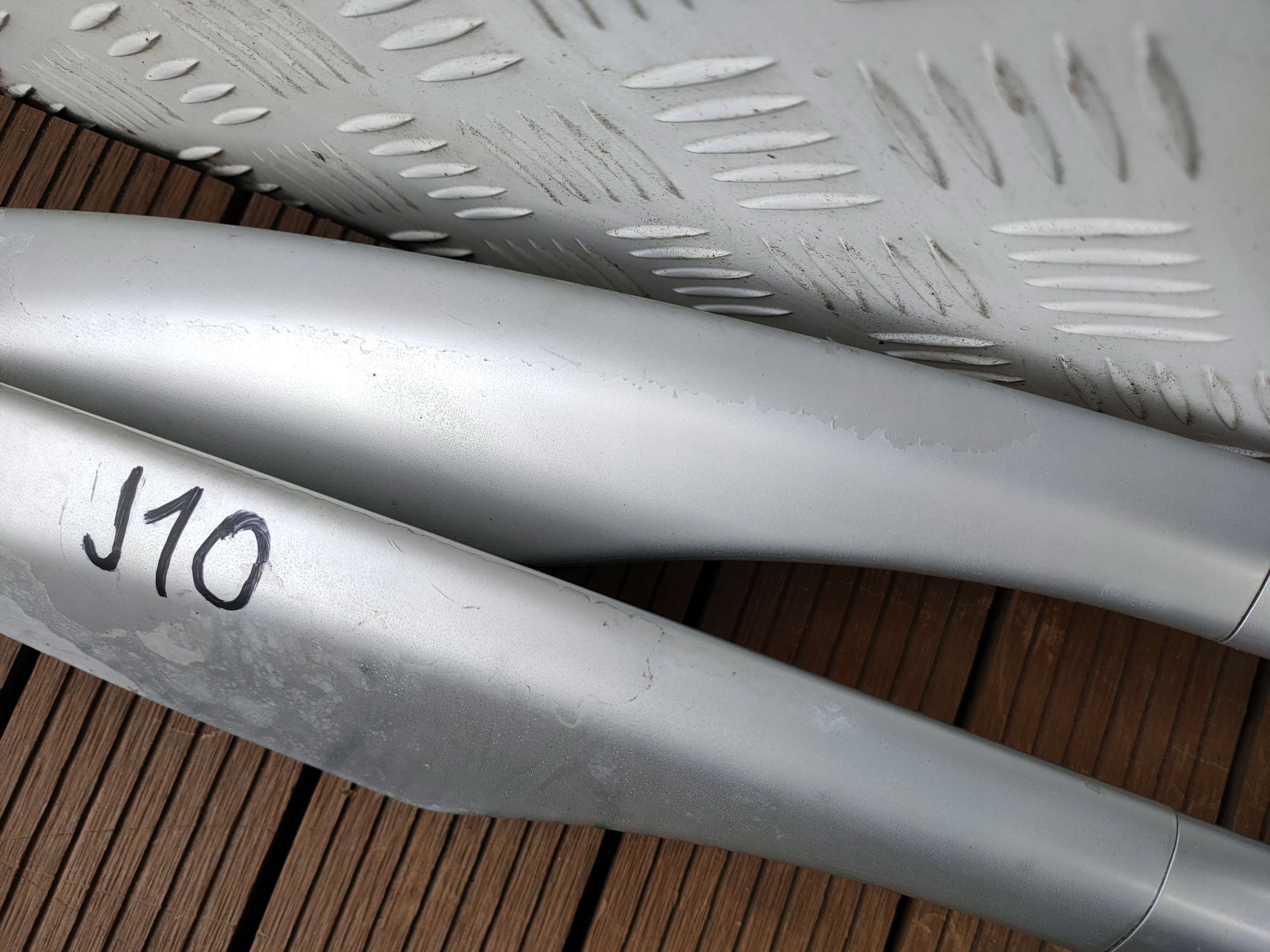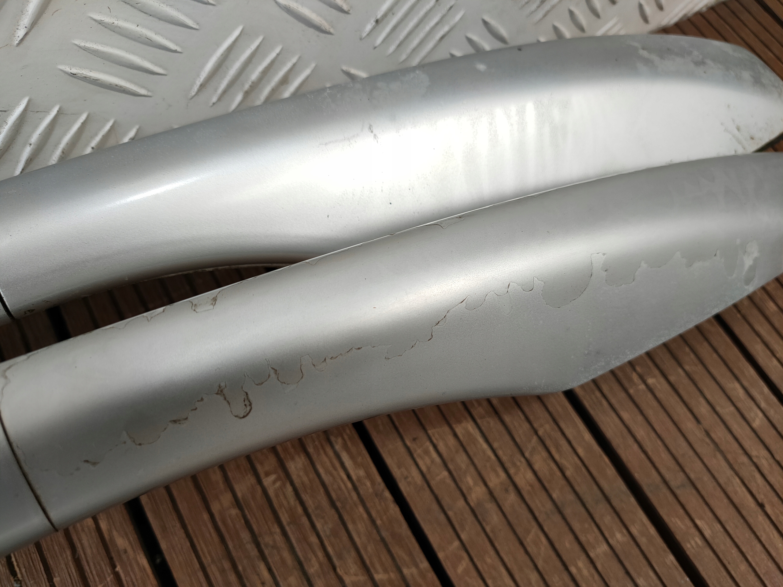 оригінальні рейки, від демонтажу, видимо в місцях подряпин та зменшення. Цілі ручки та кріплення. Ціна за набір. Загальна довжина перил - 183 см.