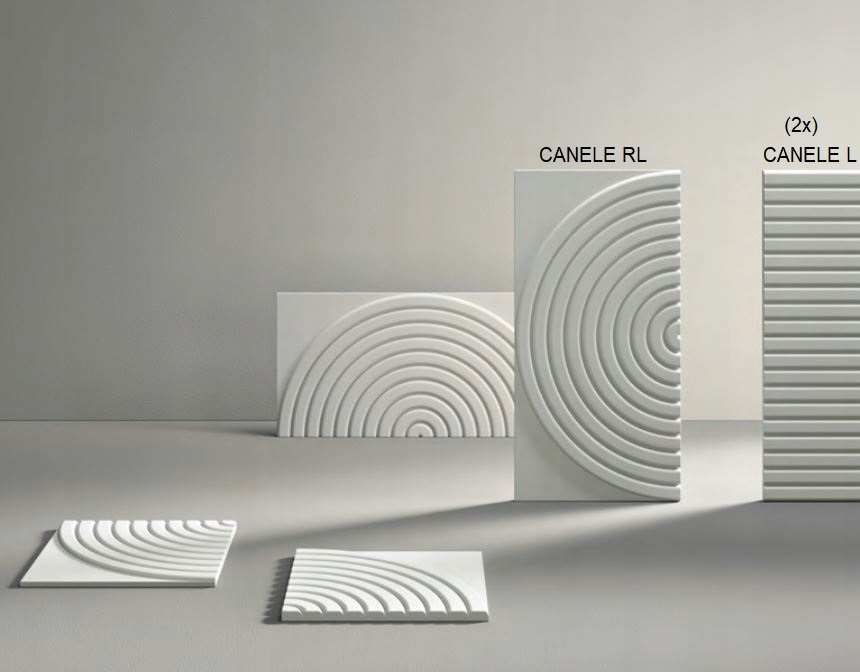 панель Canelé R L була розроблена для підключення до стінної панелі Canelé L, відкриваючи двері до ще більшої творчості та різноманітності з точки зору шаблонів та розташування стін. Його напівкругла форма відкриває нові стилістичні можливості та заохочує сміливі, вигнуті композиції. Цей настінний елемент також можна розрізати навпіл, щоб створити більше конструкцій та розширити діапазон графічних можливостей.