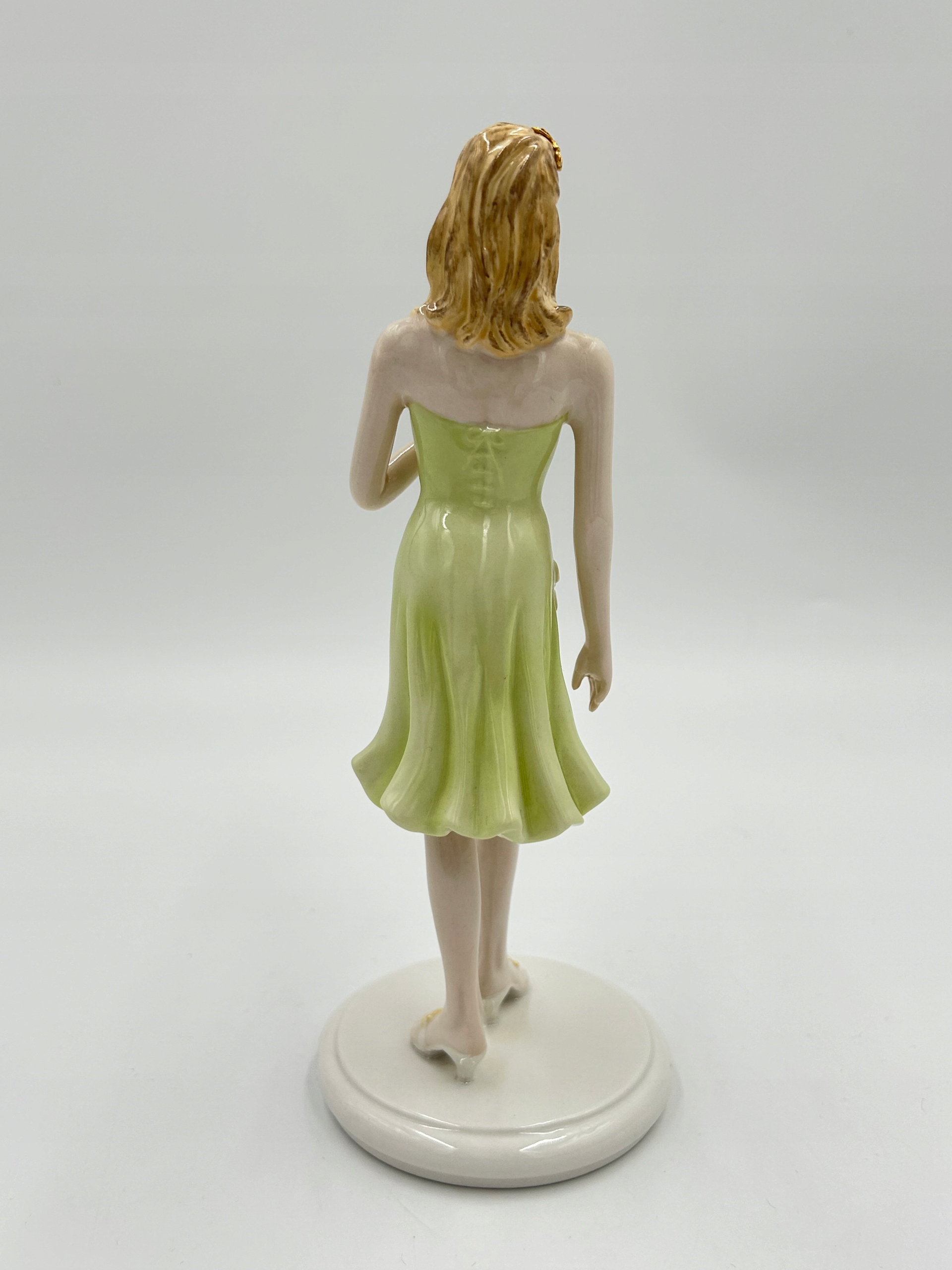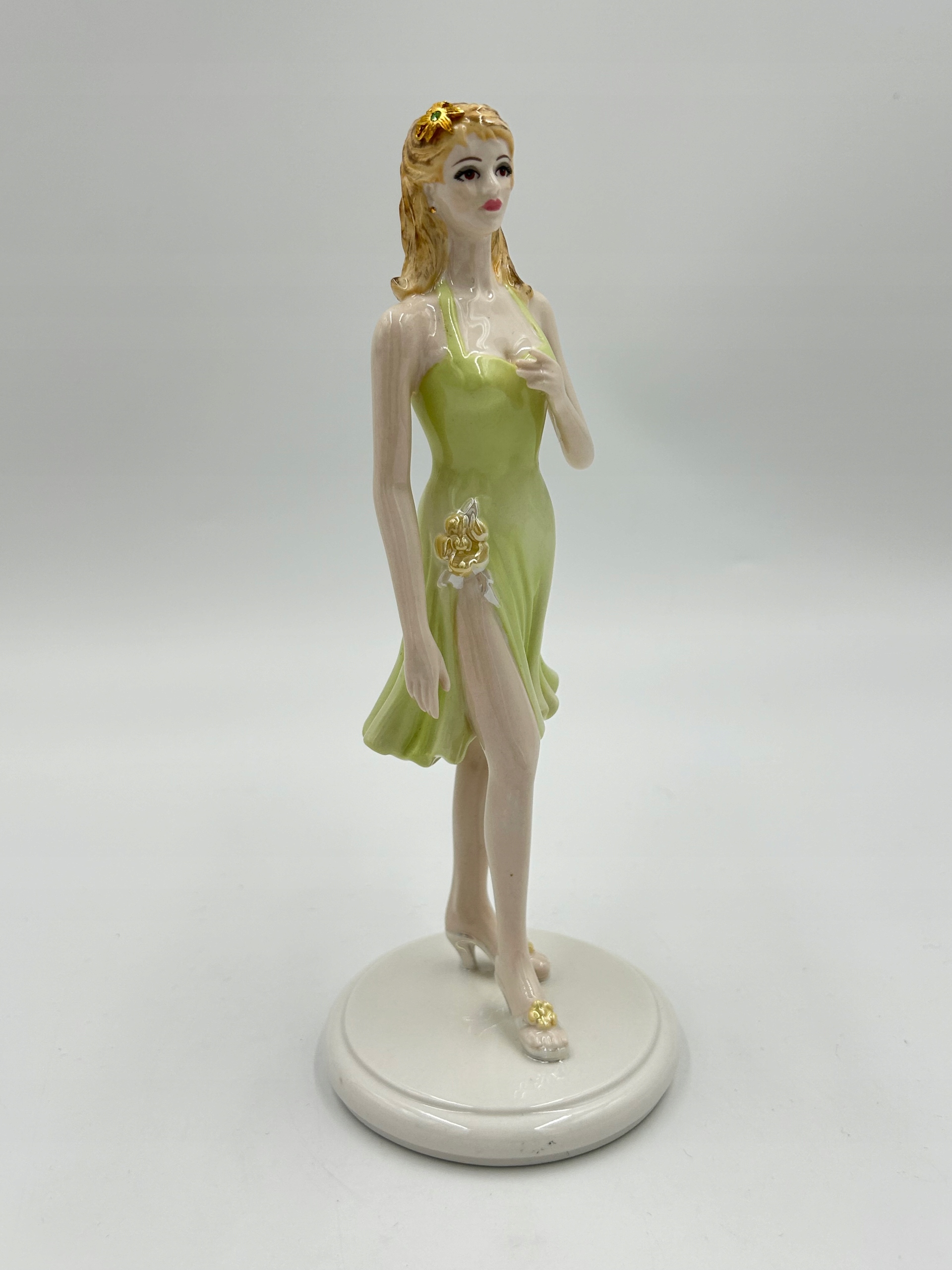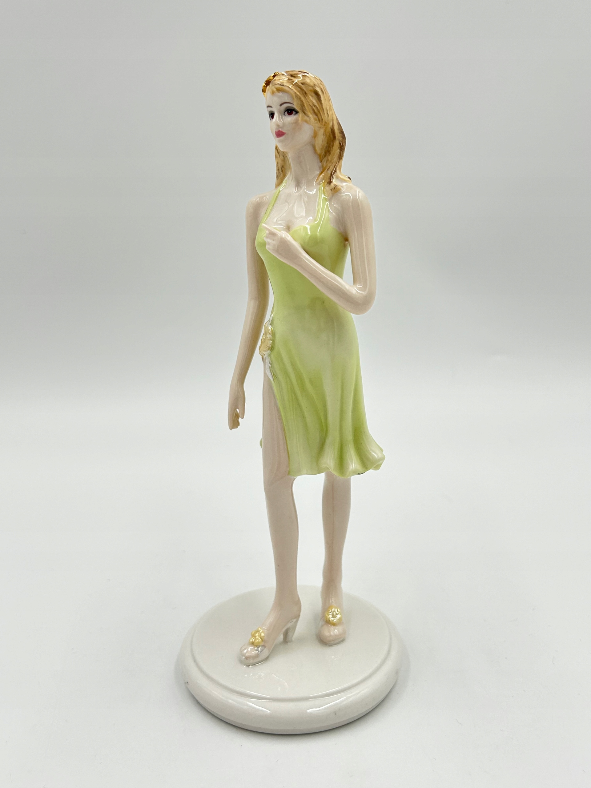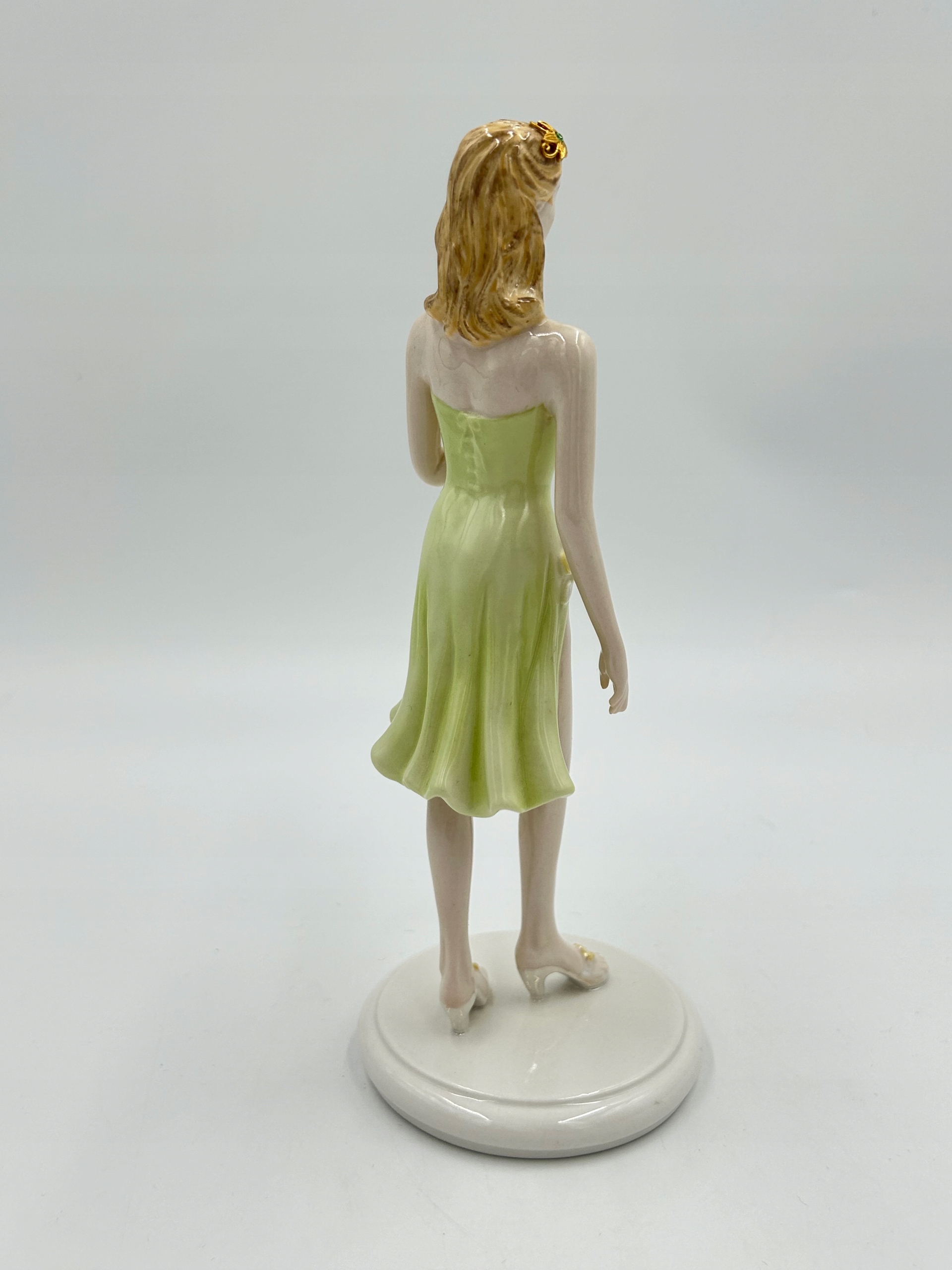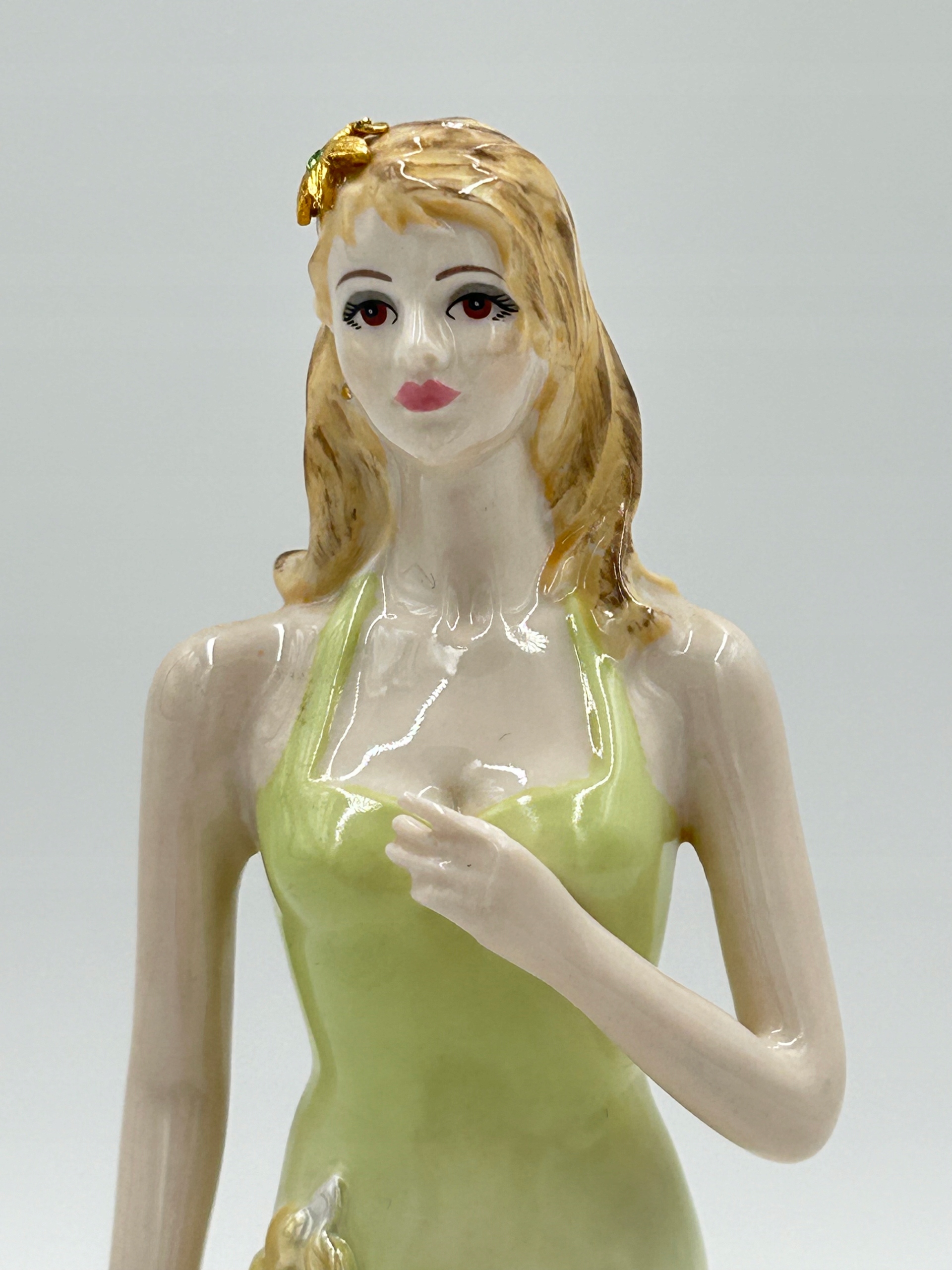 Я представляю вам прекрасну статуетку виробництва косоокпорту з колекції Brienstone - серпневий перидот . Він представляє чарівну молоду жінку в зеленій сукні, у її волоссі золота квітка з зеленим каменем. Зроблено з великою точністю та увагою до деталей. Рука -розглянута. Перл для колекціонерів та любителів англійської порцеляни.