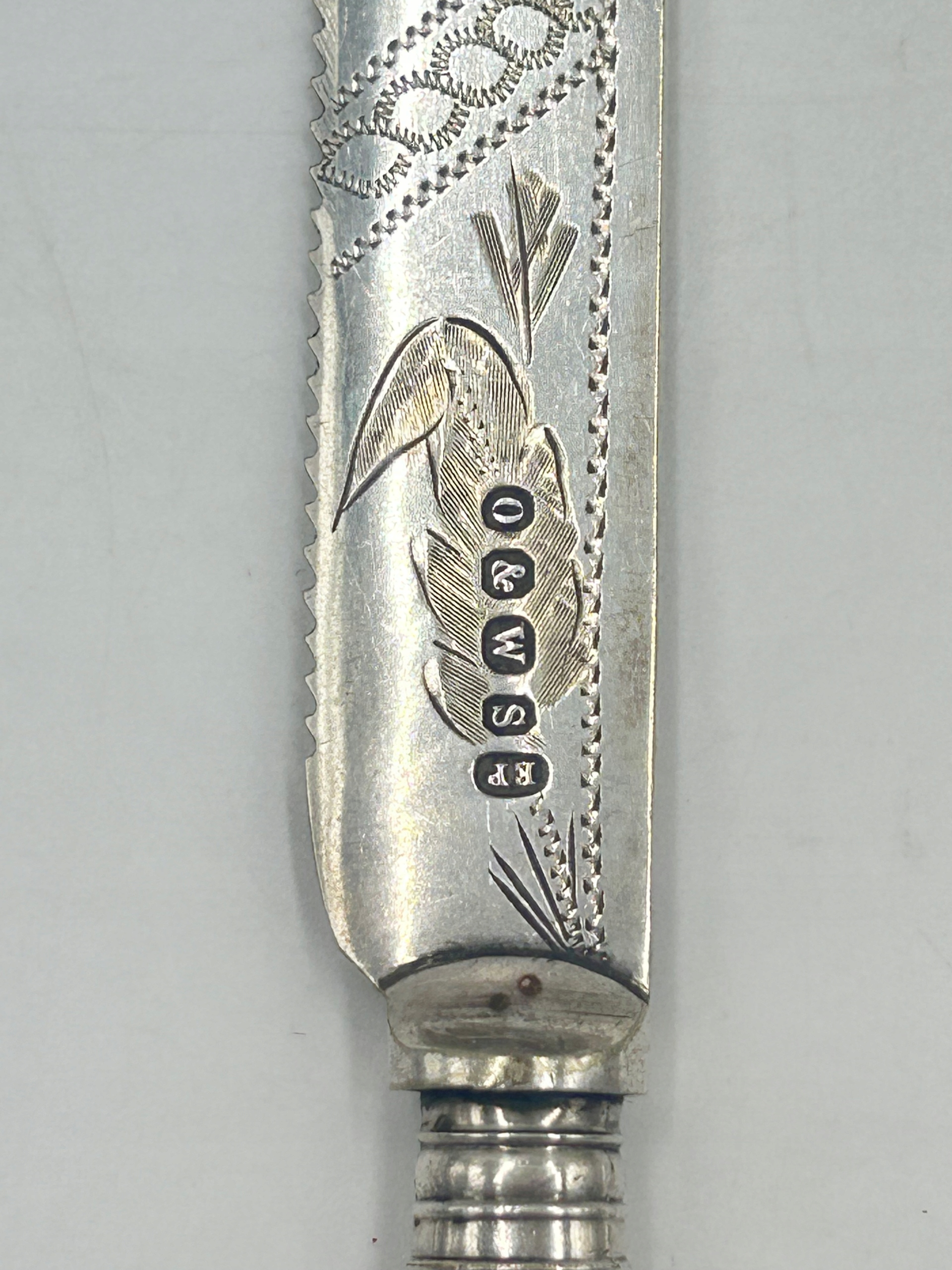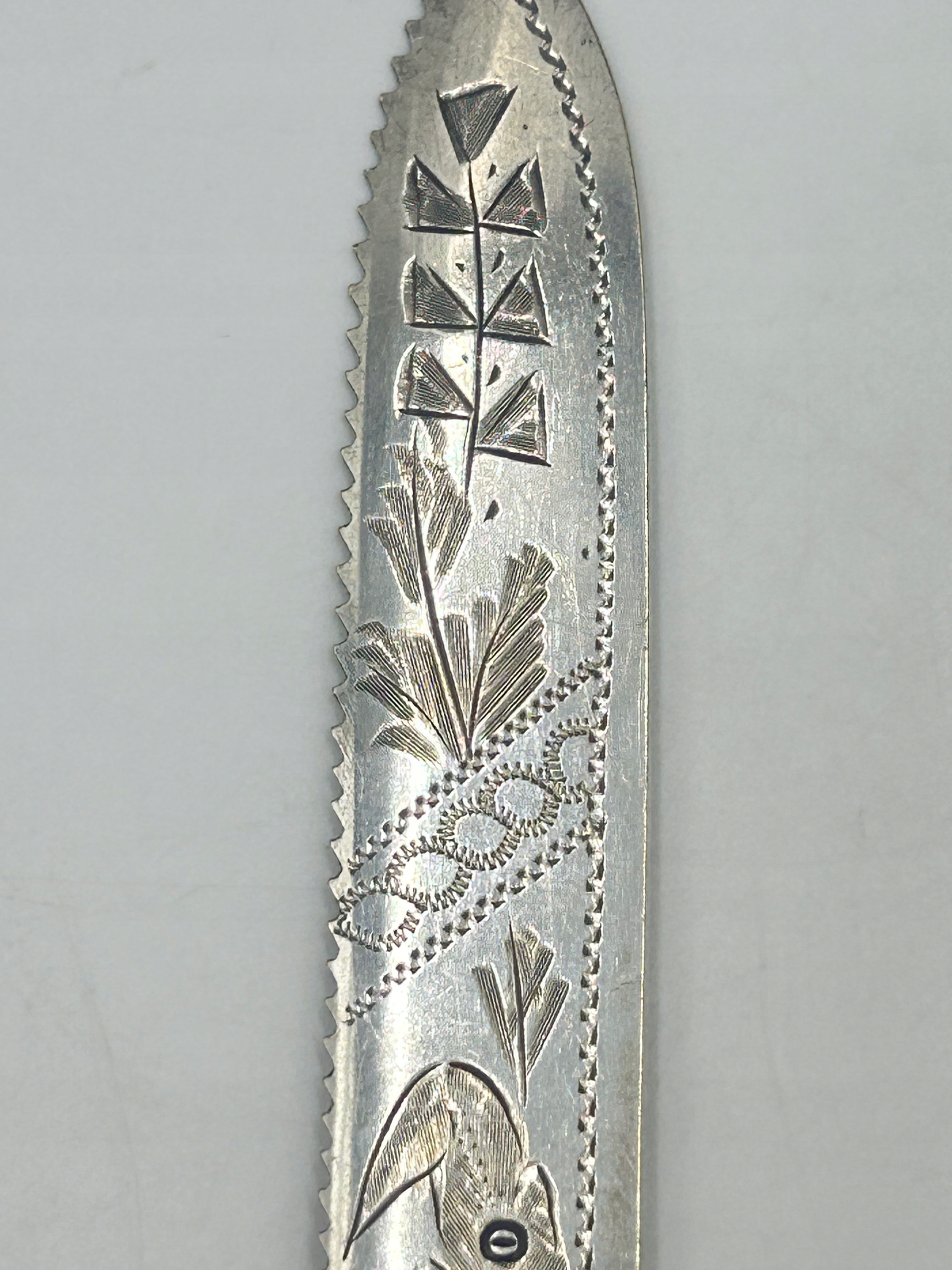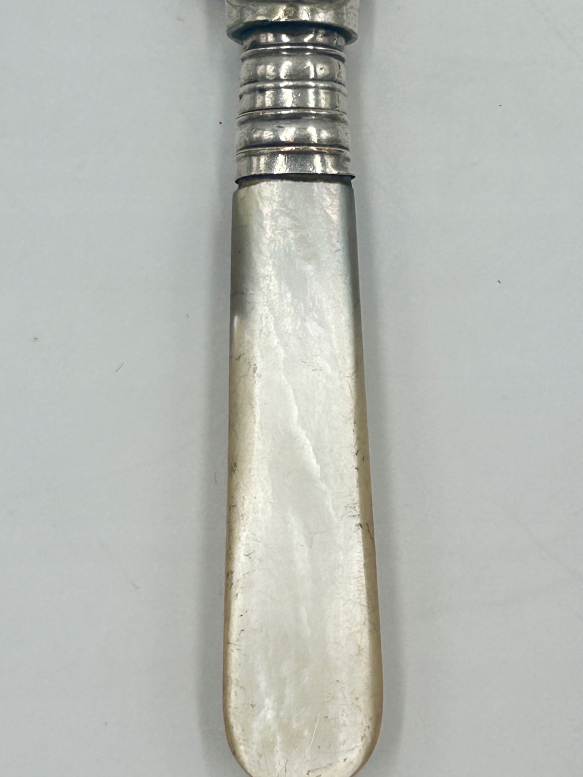 Я представляю вам історичний нож для масла красивий і ефективний, рідкісний. Лезо, прикрашене гравірованою рослиною, ручка, виготовлена з перлової маси, додає витонченість і розкішний вигляд. Прекрасний предмет колекціонера, елегантна прикраса столу.
