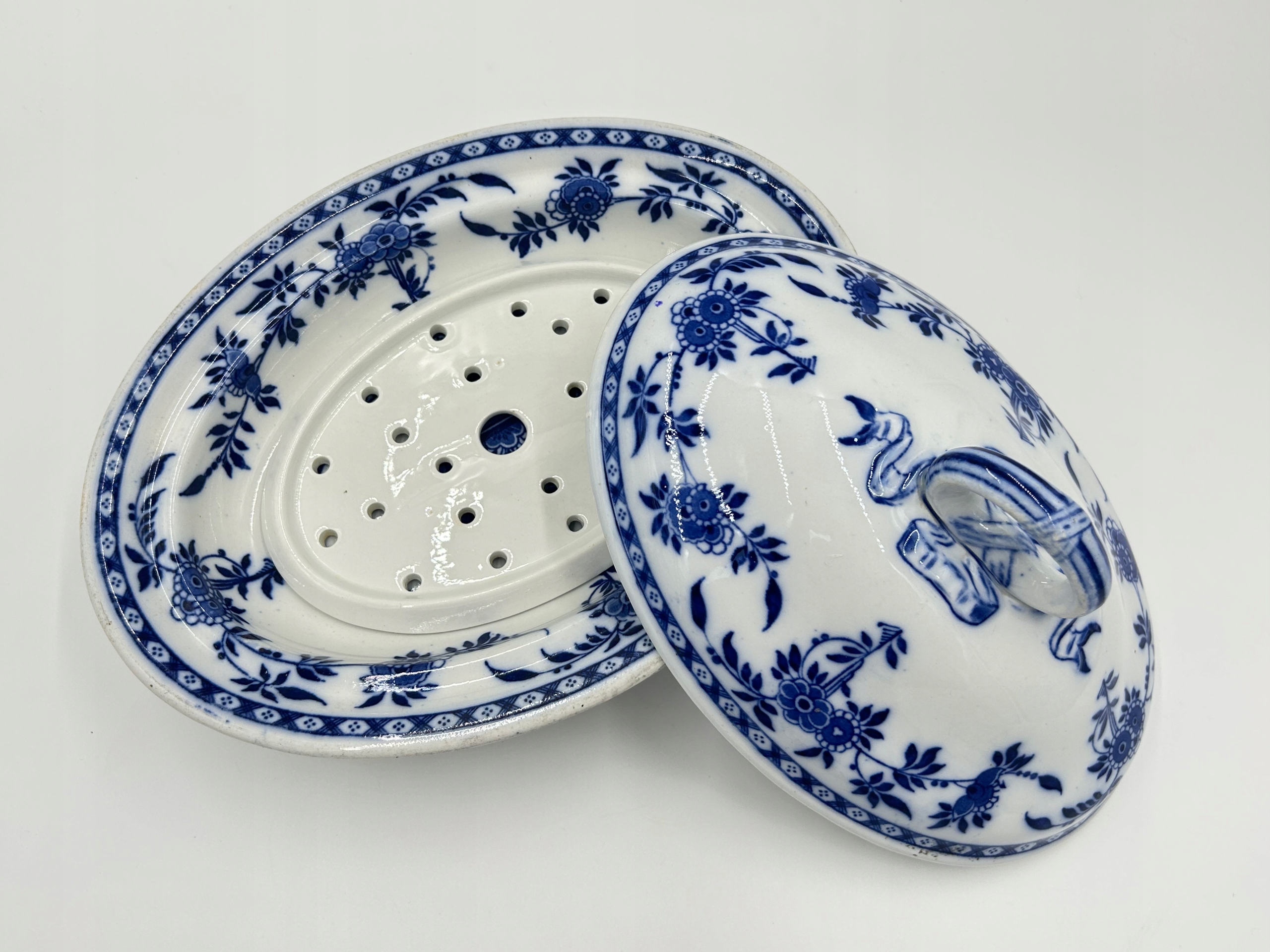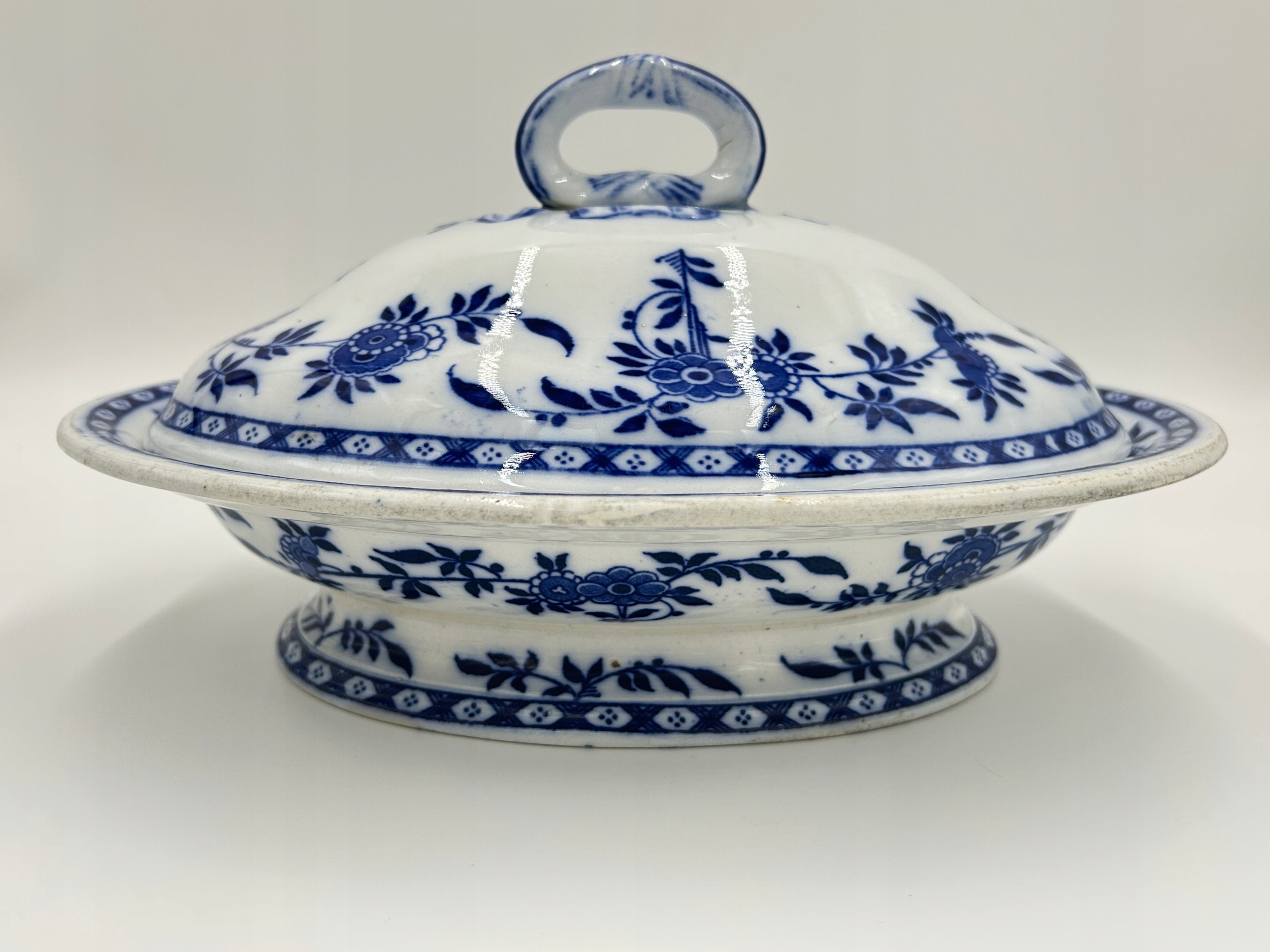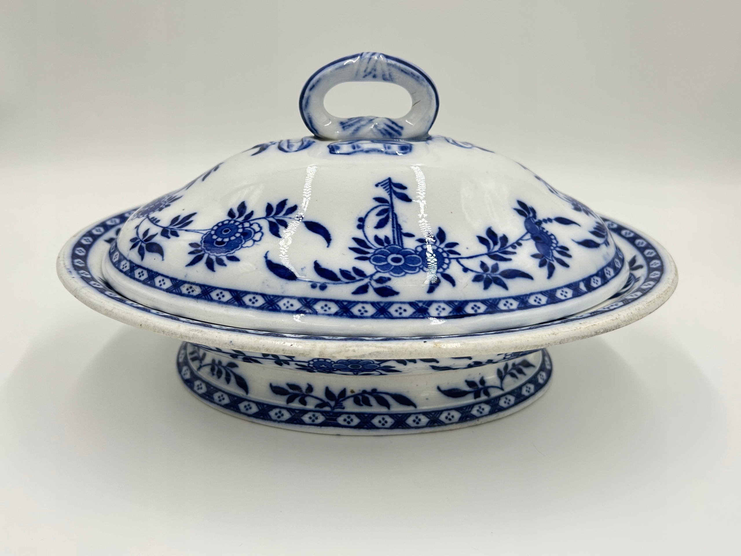 Я представляю вам елегантну, овальну миску з обкладинкою для подачі овочів, англійського виготовлення порцелянового порцеляни, Delft Blue & White. Старе судно з довгою історією, в хорошому стані для свого віку.