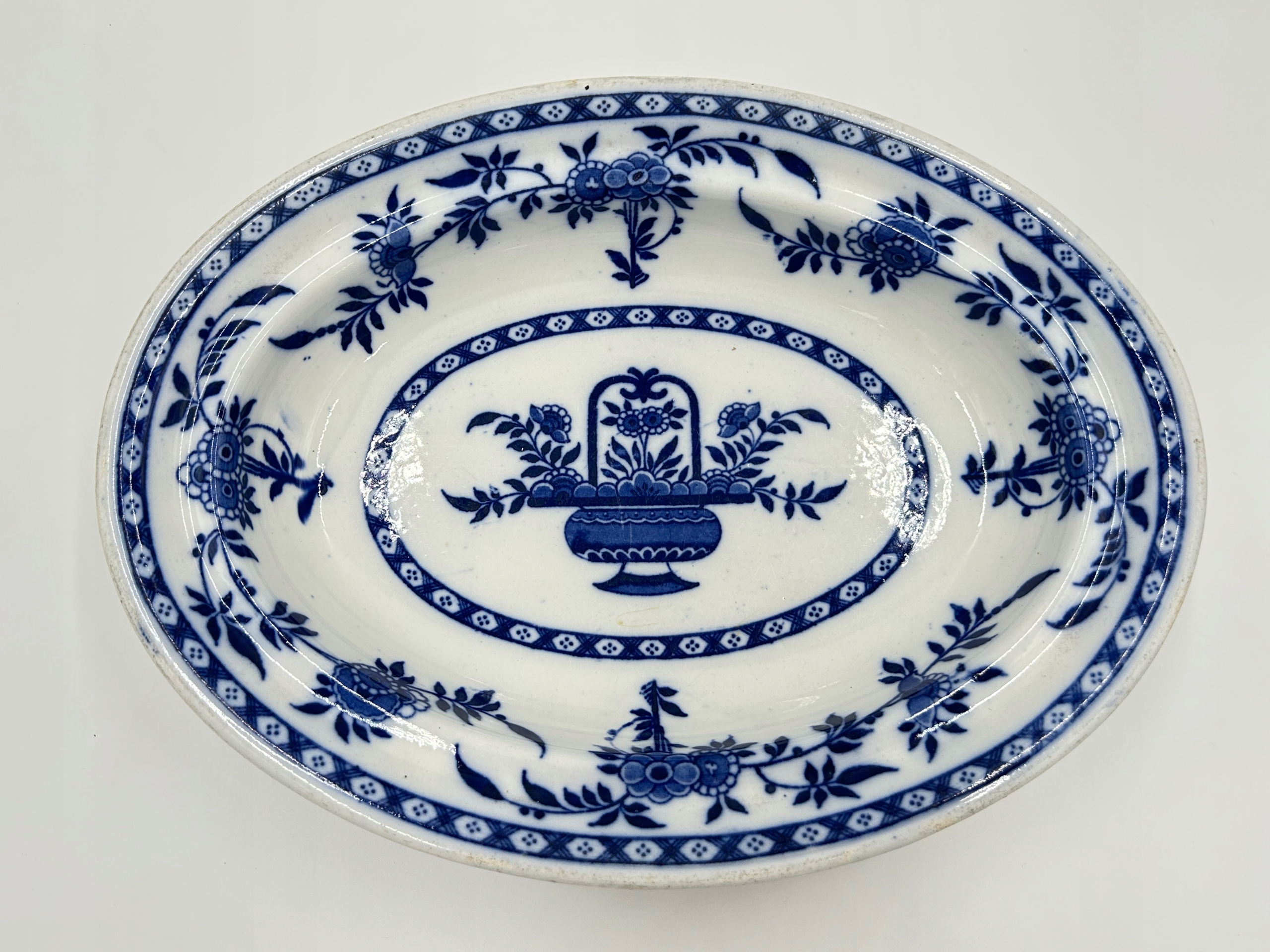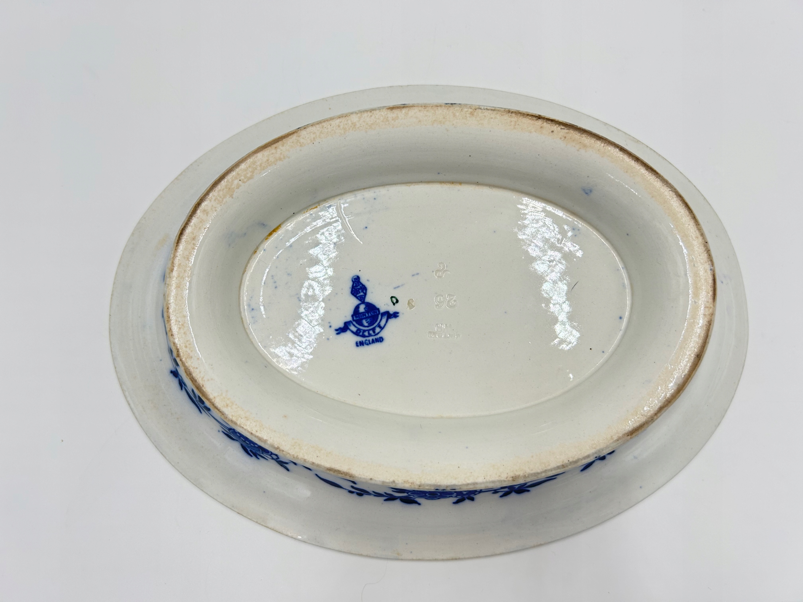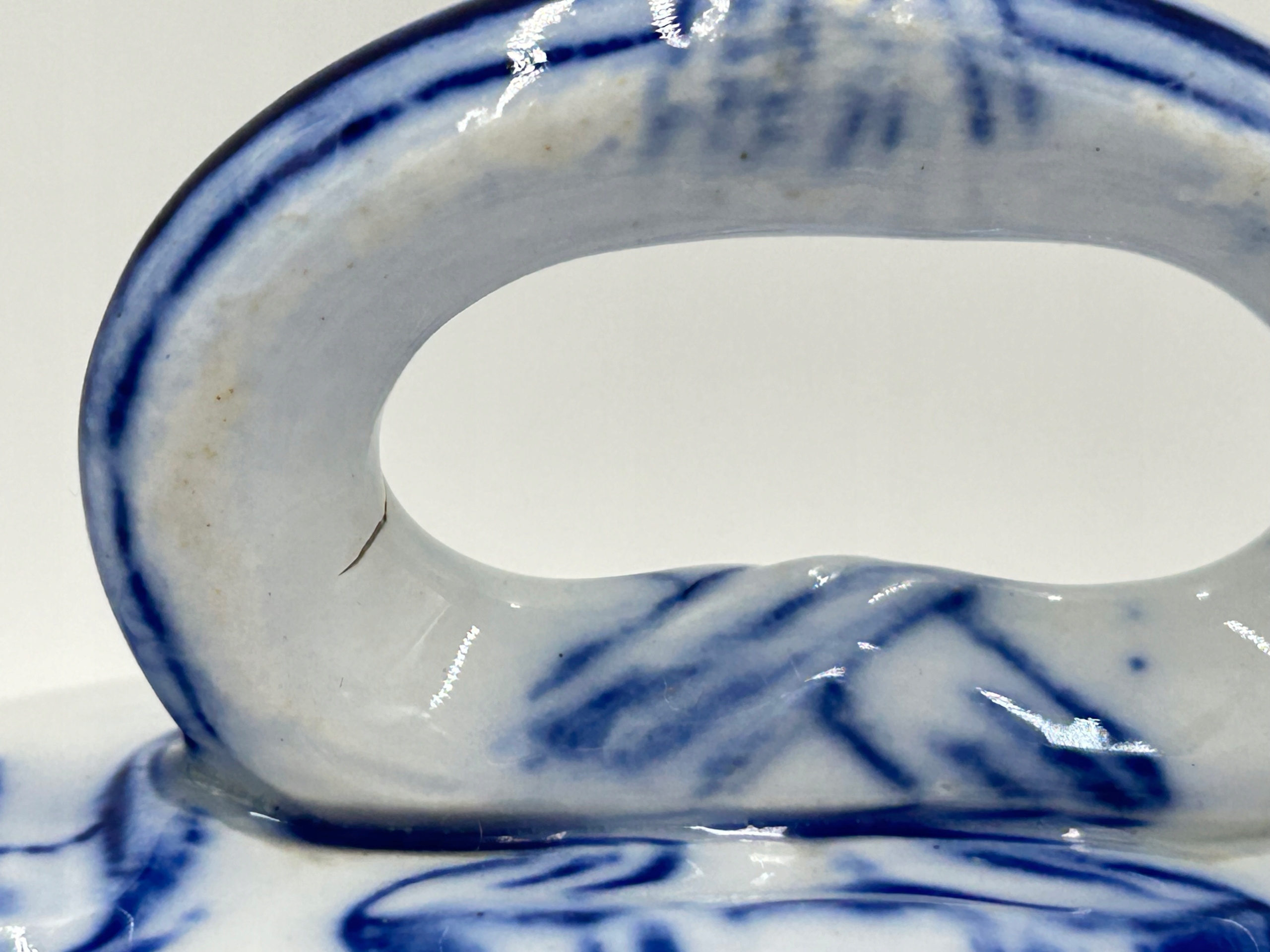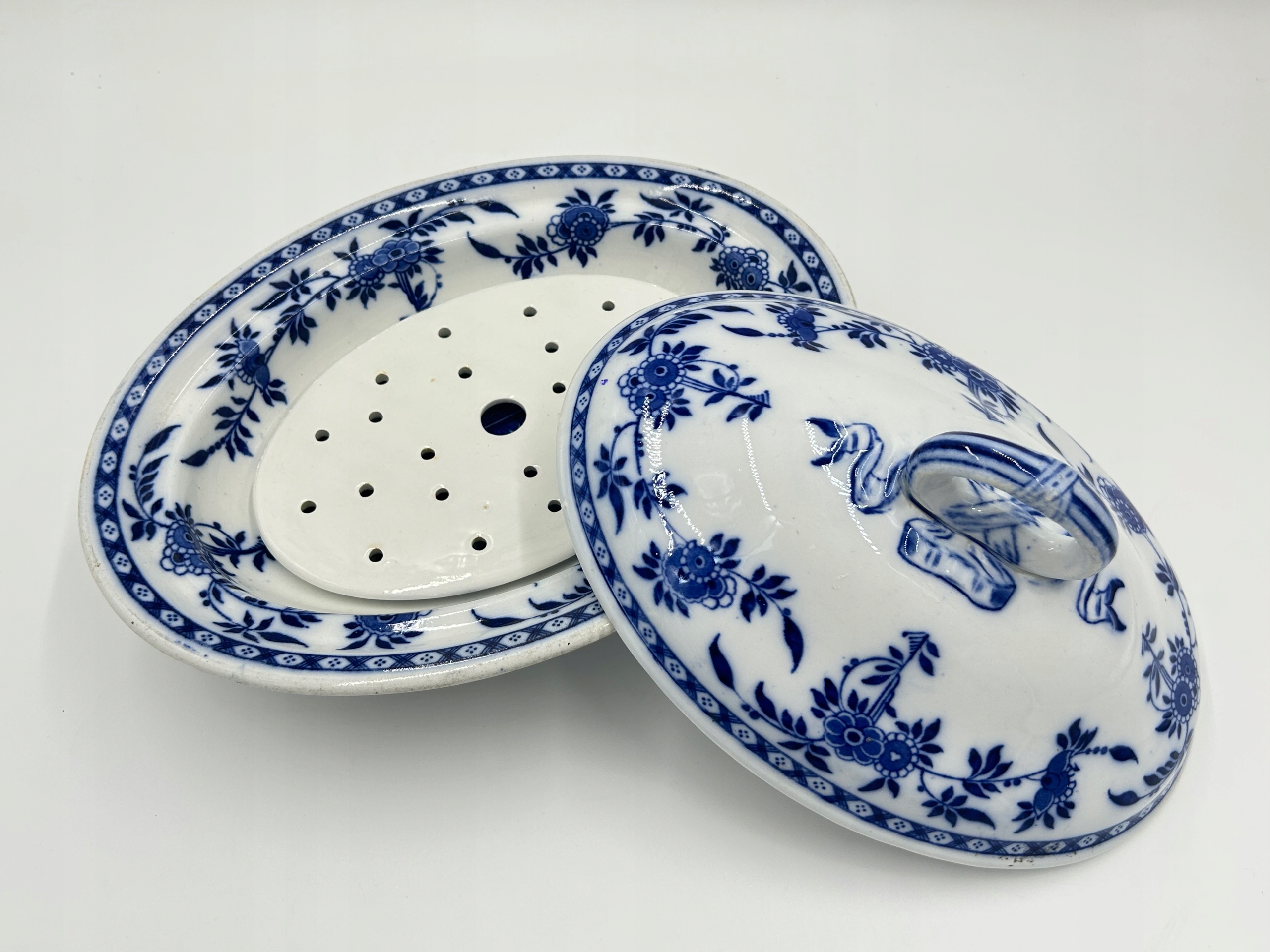 Я представляю вам елегантну, овальну миску з обкладинкою для подачі овочів, англійського виготовлення порцелянового порцеляни, Delft Blue & White. Старе судно з довгою історією, в хорошому стані для свого віку.