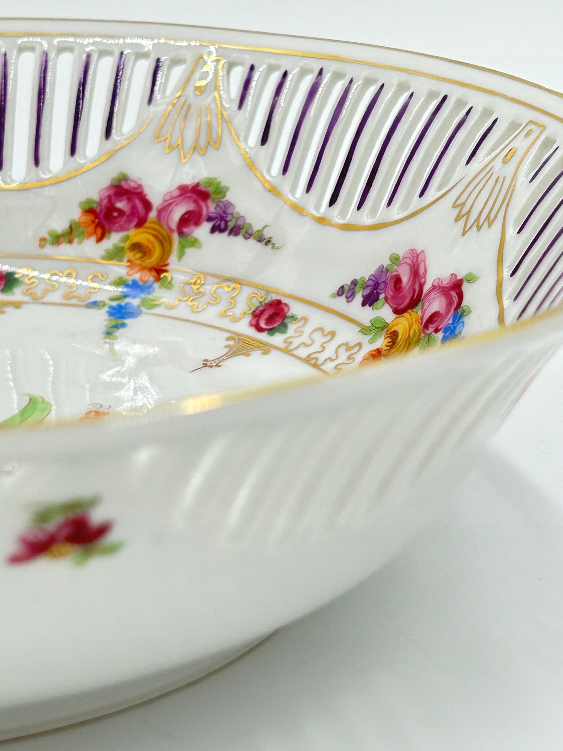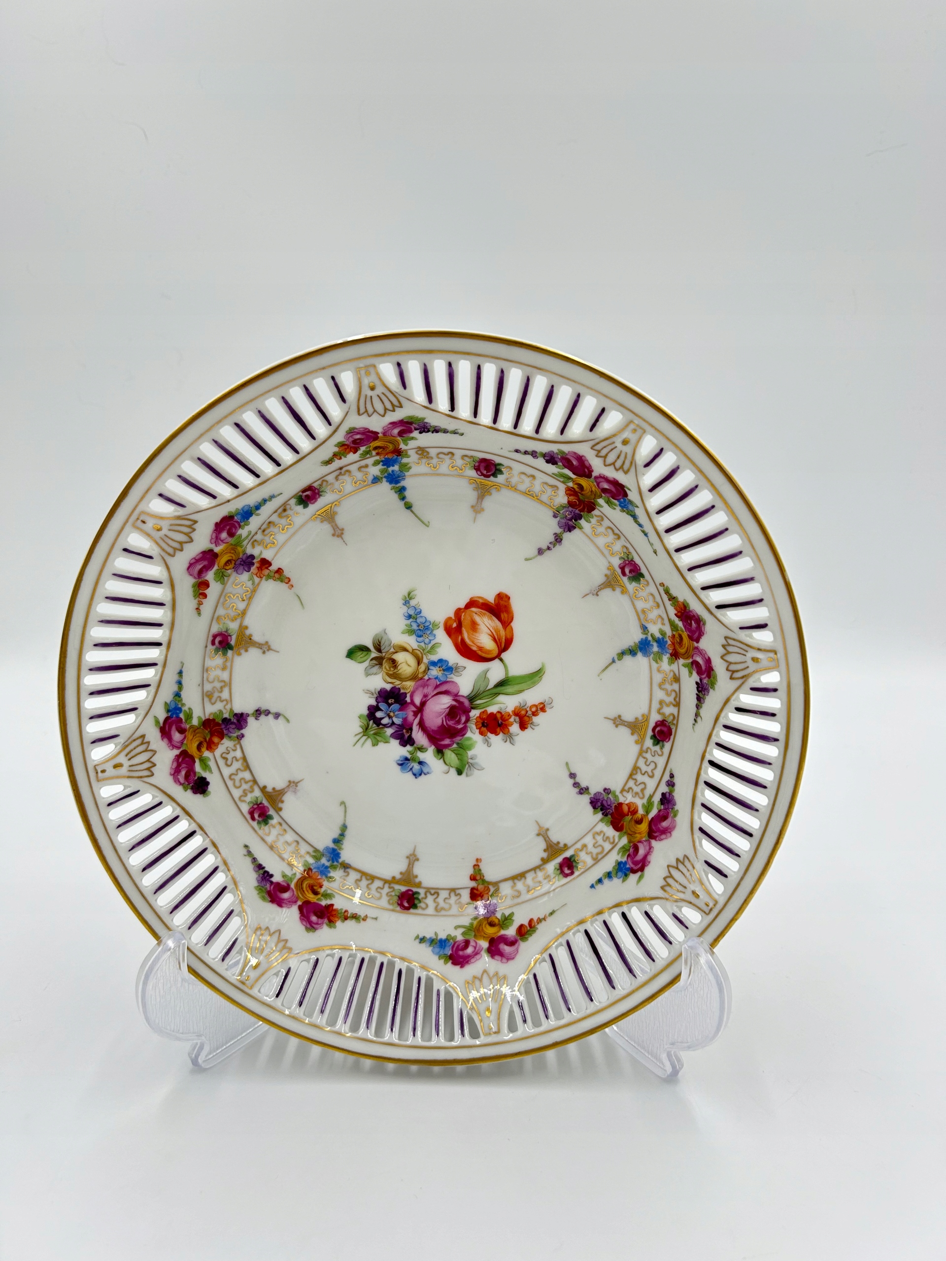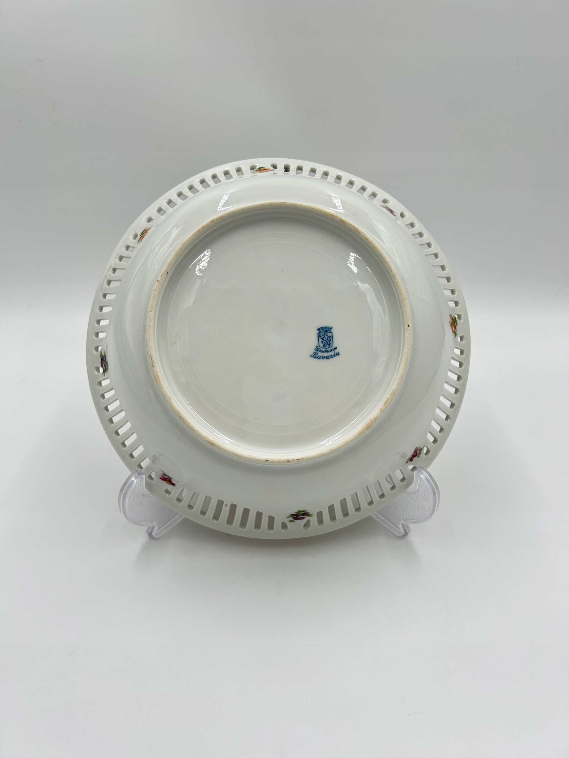 Тема продажу - прекрасний плід відкритого виробництва Manufaktura Schumann Bavaria. Велика фруктова вода, прикрашена квітковим мотивом, золотим краєм та облямівкою, краю відкритої роботи. Прекрасний декоративний елемент, унікальна копія.