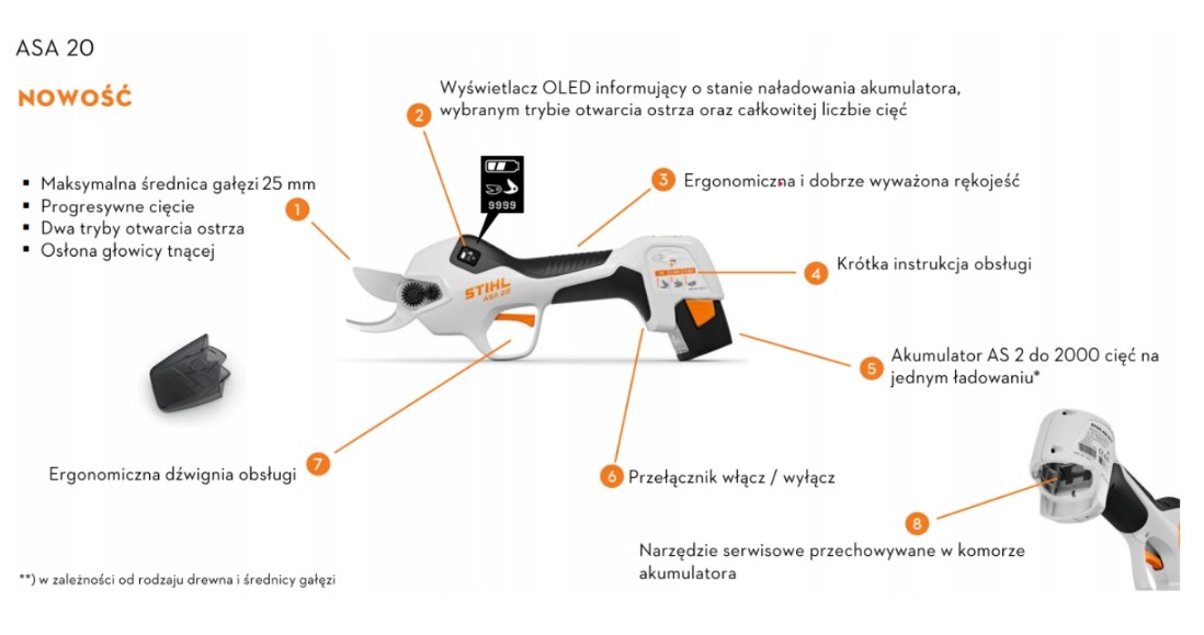 зарядний пристрійstihl asa 20 обрізки акумуляторів - це відмінний інструмент для обрізки дерев, живоплотів, чагарників, декоративних рослин та лоз, як у домашніх садах, так і в великих сільськогосподарських районах та виноградниках. Завдяки запасу акумулятора STIHL як системи, ці обрізки пропонують користувачам простоту використання та нижчої сили роботи. Його леза залишаються різкими протягом тривалого часу, легко обслуговувати та забезпечити точні, плавні надрізи, що знижує ризик зараження рослинами та підтримує їх здоровий ріст.