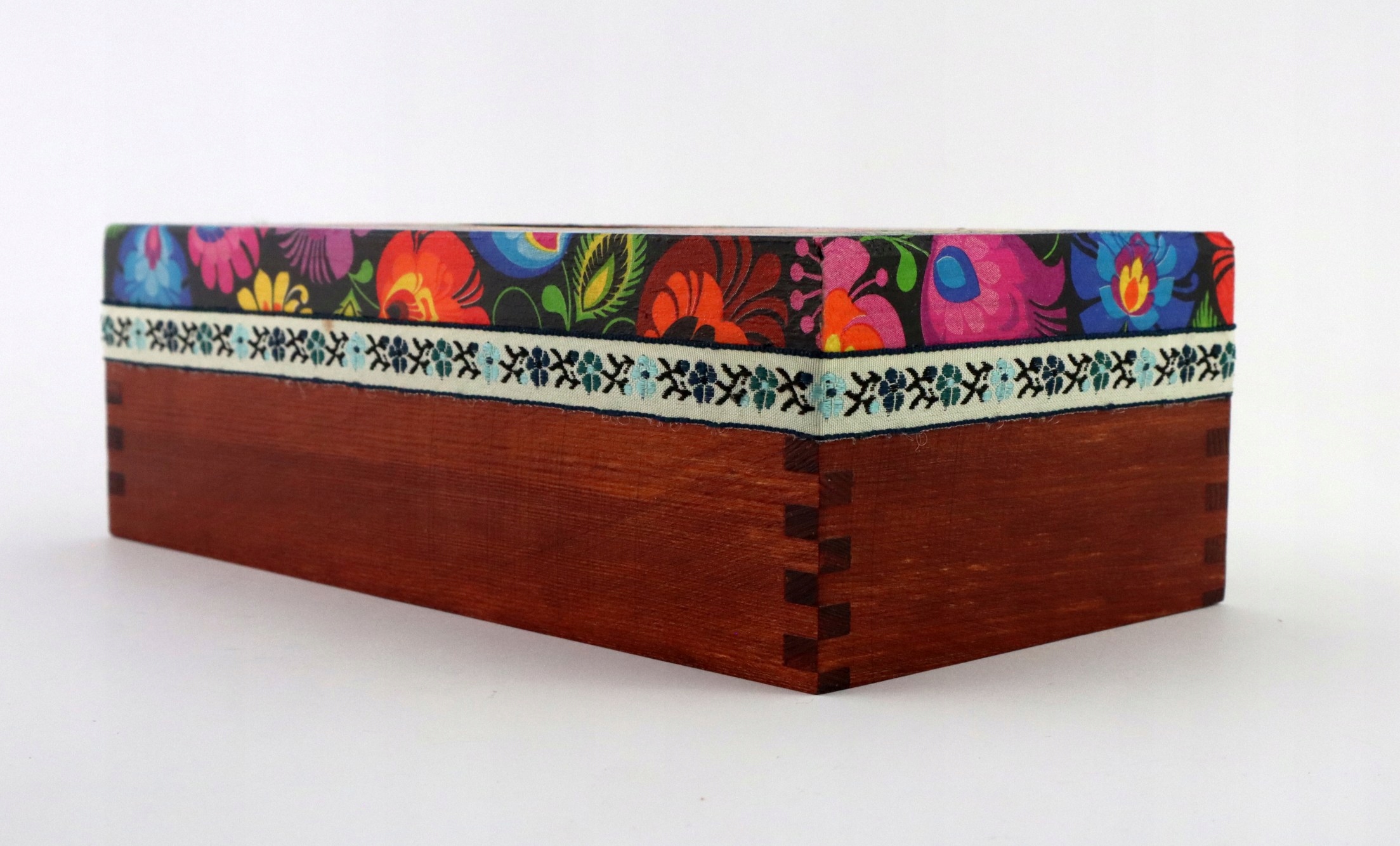 Одним із найхарактерніших елементів цієї коробки є візерунок Ловича. Ми використали барвистий квітковий візерунок, який чудово поєднується з відтінком рожевого дерева на чорному тлі. Цей візерунок додає коробці унікальний фольклорний характер.