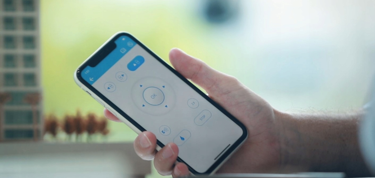 Роботом для миття вікон HOBOT R3 можна керувати трьома способами: за допомогою кнопки EasyStart на корпусі, пульта дистанційного керування, що входить у комплект, або за допомогою смартфона ! Це особливо важливо, коли він використовується для очищення великих поверхонь, щоб у разі потреби його можна було відправити назад у потрібне місце або повернути «дистанційно», навіть не перебуваючи поблизу!