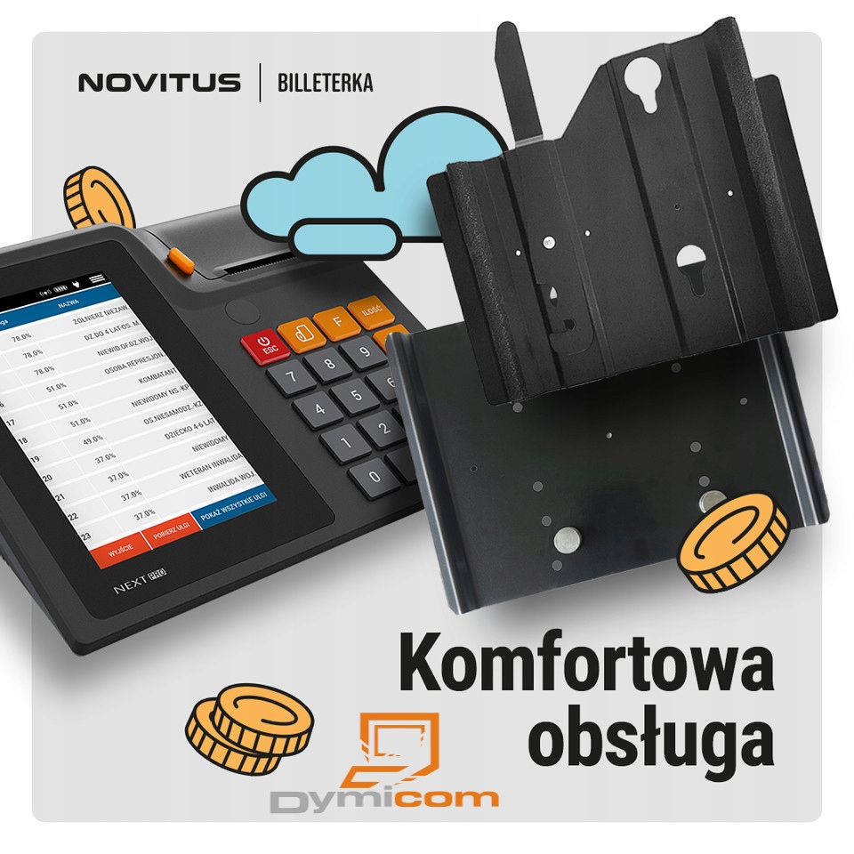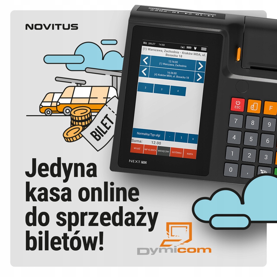 Спеціальний касовий апарат для ведення обліку при наданні послуг пасажирського транспорту з погодженням квитків на онлайн-принтері.Продаж квитків у транспортних засобах можливий за допомогою програми Billeterka, яка є постійно реалізовано в системі Android пристроїв NEXT PRO і NEXT PRO BUS. Додаток Billeterka дозволяє просто та ефективно продавати одноразові та місячні квитки (звичайні, пільгові) водієм у транспортному засобі чи стаціонарно на вокзалі. Billeterka віддалено підключена до веб-додатку (system.billeterka.pl), де перевізники можуть зручно готувати свої розклади (зупинки, лінії, прайс-листи, курси). Підготовлені таким чином дані надсилаються бездротовим способом на вказані пристрої NEXT PRO для програми Billeterka. Продаж квитків водіями надсилається на індивідуальний рахунок перевізника (system.billetrka.pl). З цього облікового запису перевізник може складати будь-які виписки та звіти для маршальських управлінь. Додаткові аксесуари для каси: касовий ящик, автомобільний адаптер, монтажні кронштейни, зовнішній GSM USB-модем.