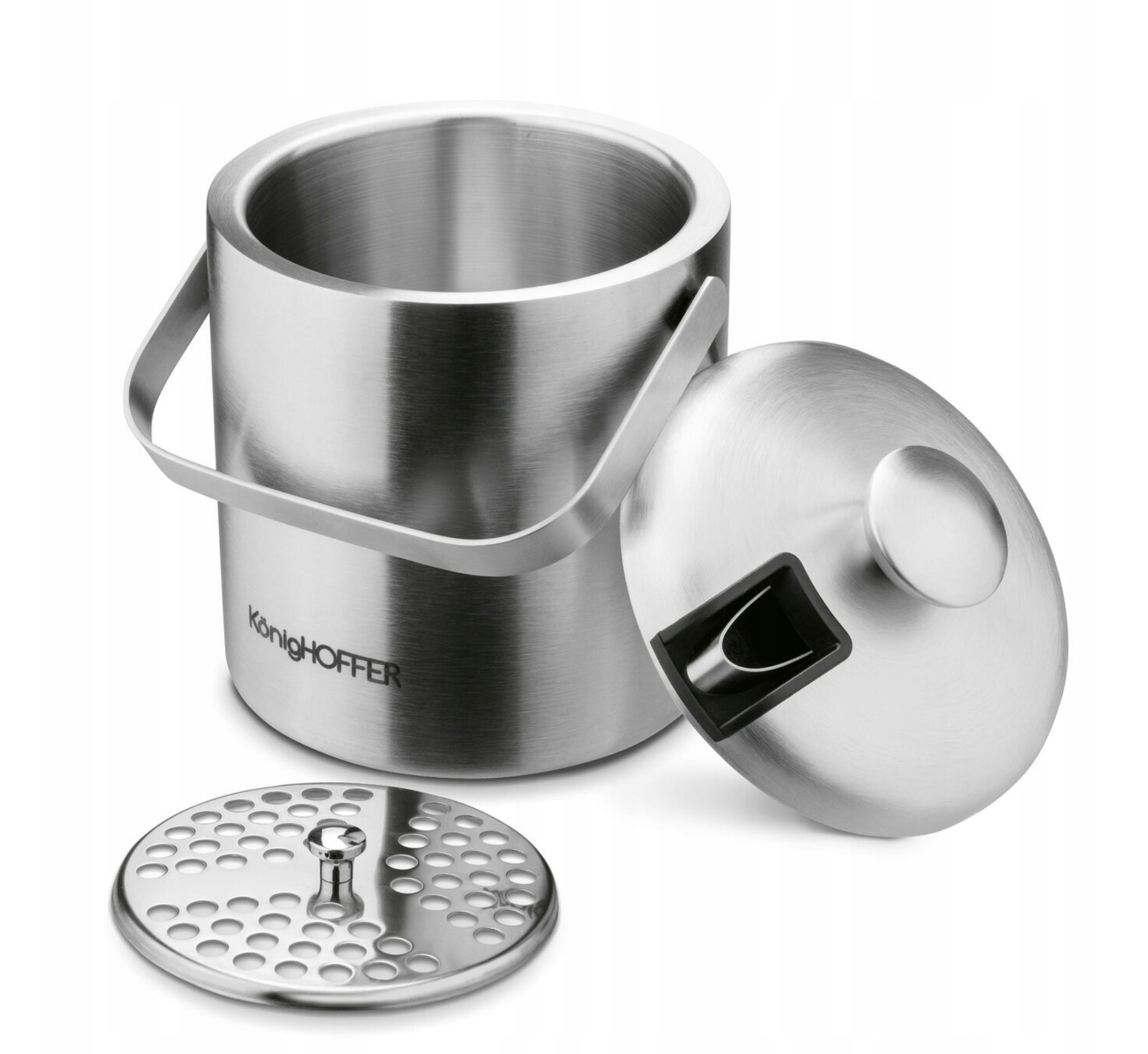 Представлено The ice відро виготовлено з нержавіючої сталі. Його дизайн має атласне покриття та місце в кришці, виділене чорним пластиком, де ви можете легко сховати щипці, необхідні для розміщення кубиків льоду.