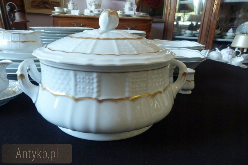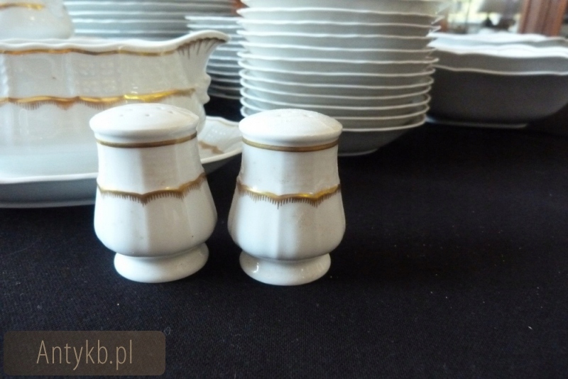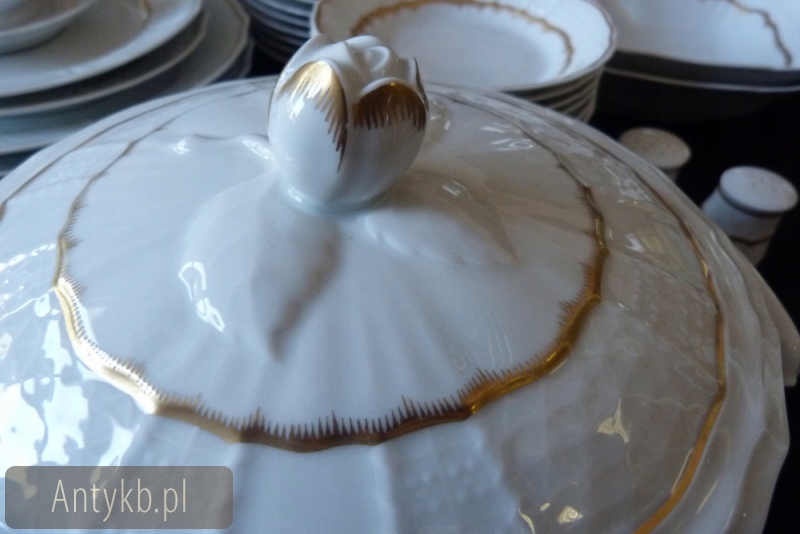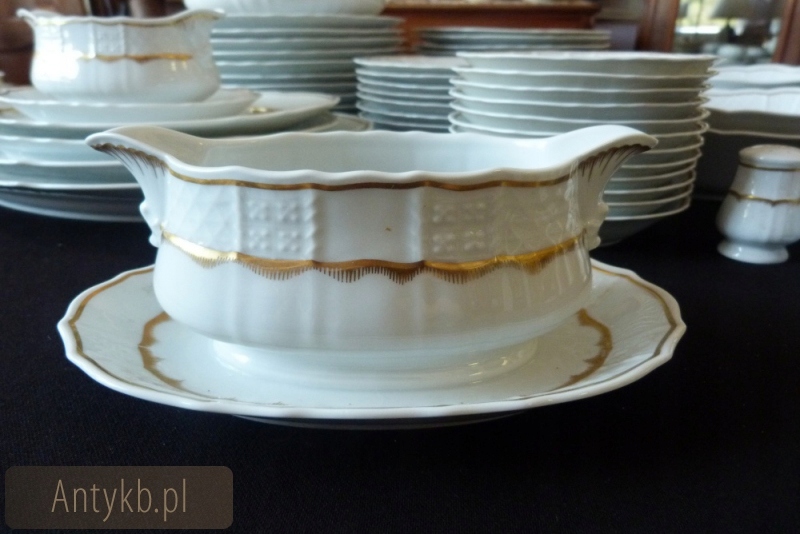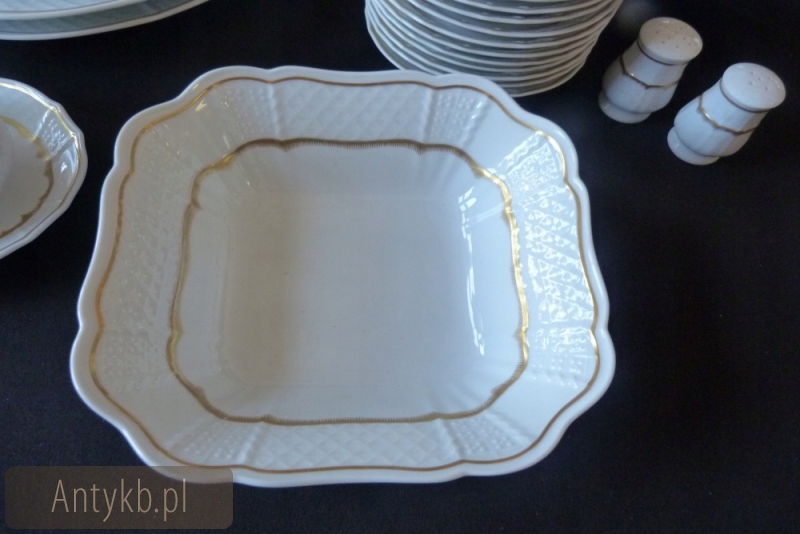 Сервіз обідній на 11 осіб, виробництва Villeroy Boch-Heinrich, модель Louisenburg Flame of gold, періоду 1970-74 років, виготовлений з білої порцеляни, декорований золотом у вигляді полум'я.Сервіз складається з 59 частин. На 2 мілких видно невеликий скол на тарілках.Набір виглядає дуже ефектно, також є миски та ємності для солі та перцю. Підходить для посудомийної машини. Рекомендую.