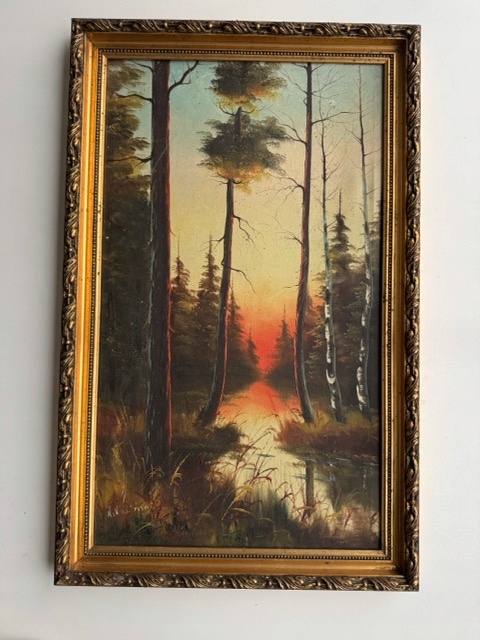 Obraz pejzaż leśny w starej, złoconej ramie (vintage/antyk)