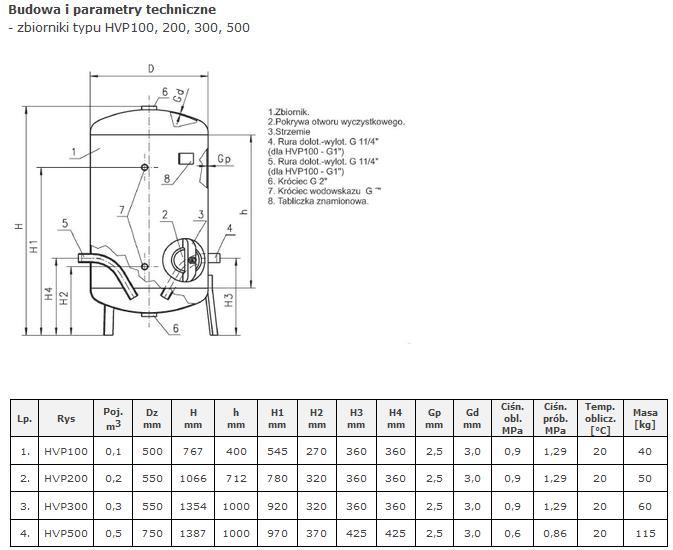 Напірний бак HVP виготовлений із суцільнозварної листової низьковуглецевої сталі ємністю 100, 200, 300, 500, 1000 л. Бак можна встановлювати лише в системах, у яких максимальна тиск не перевищує розрахункового тиску даного типу цистерни.Внутрішня частина покрита захисним цинковим покриттям.