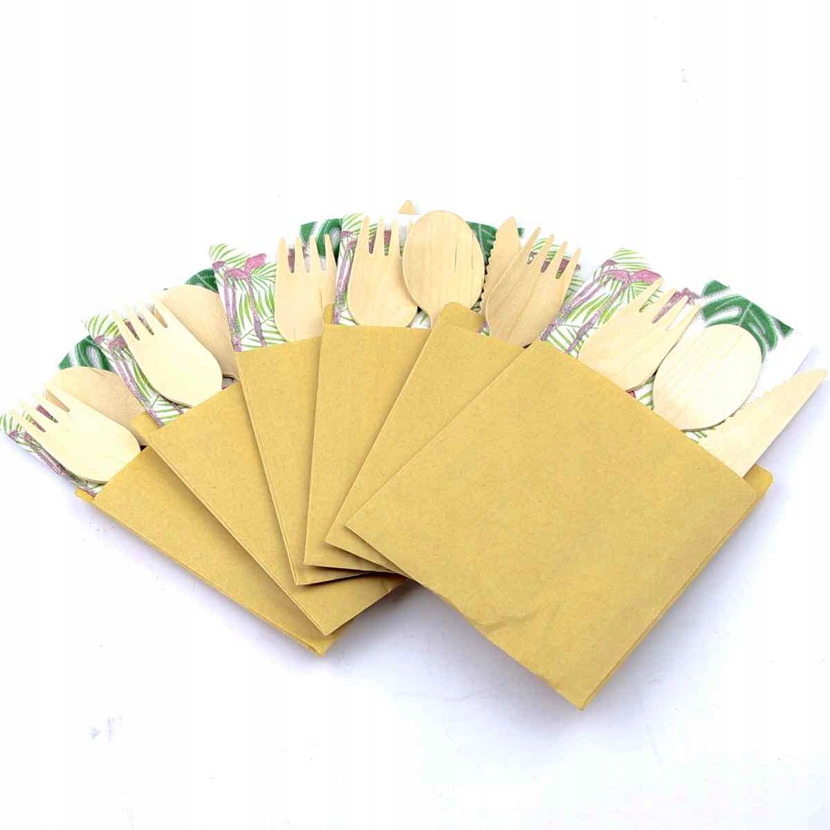 Набір дерев'яних столових приладів із серветкою з тропічними акцентами, елегантно упакований.
