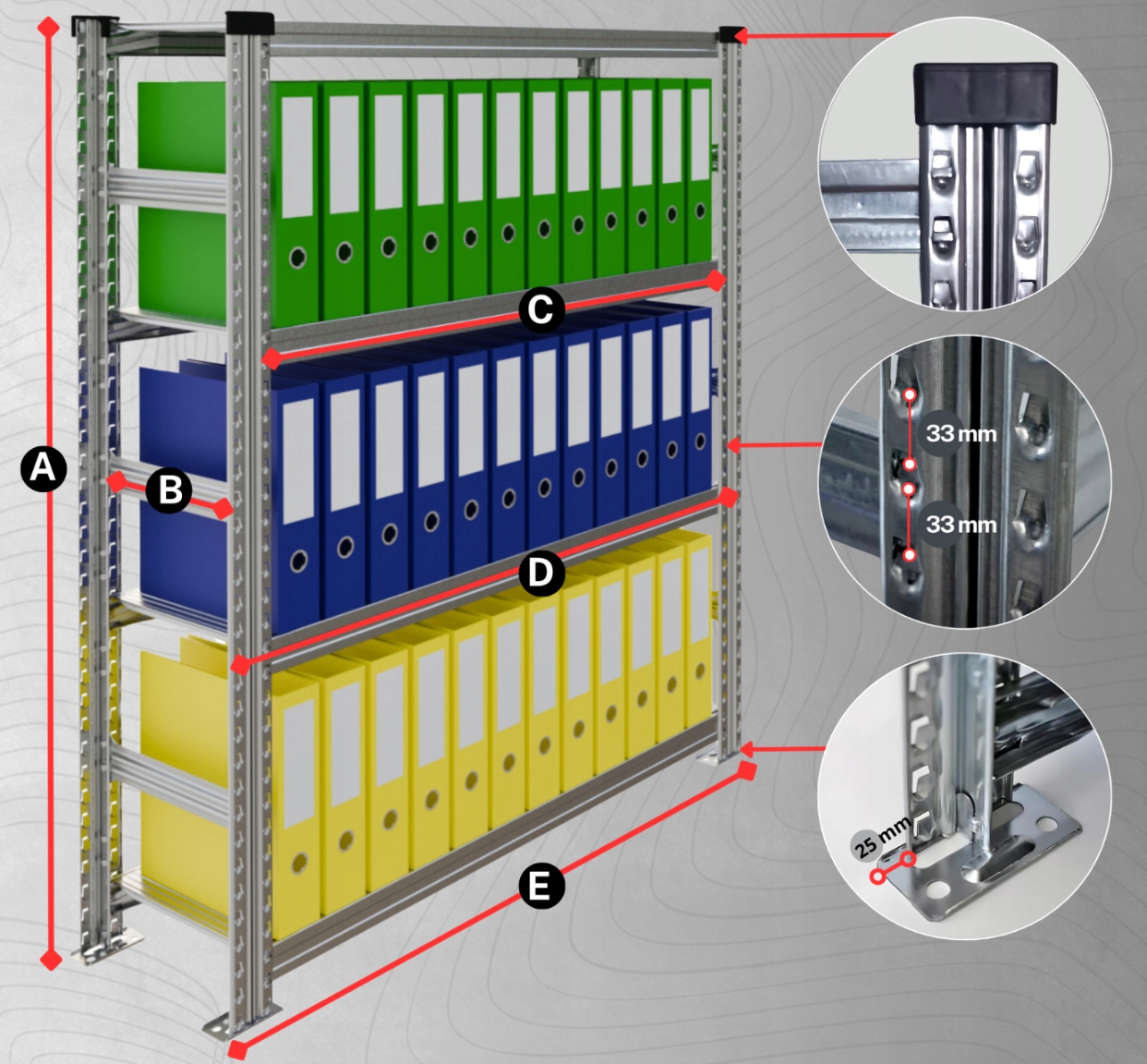 Наші полиці - це модульні системи. Це означає можливість розширення з наступними сегментами або розширеннями додатковими поличками навіть після декількох років використання. Широкий спектр можливостей розширення доступний залежно від наявної поверхні та методу зберігання документів.