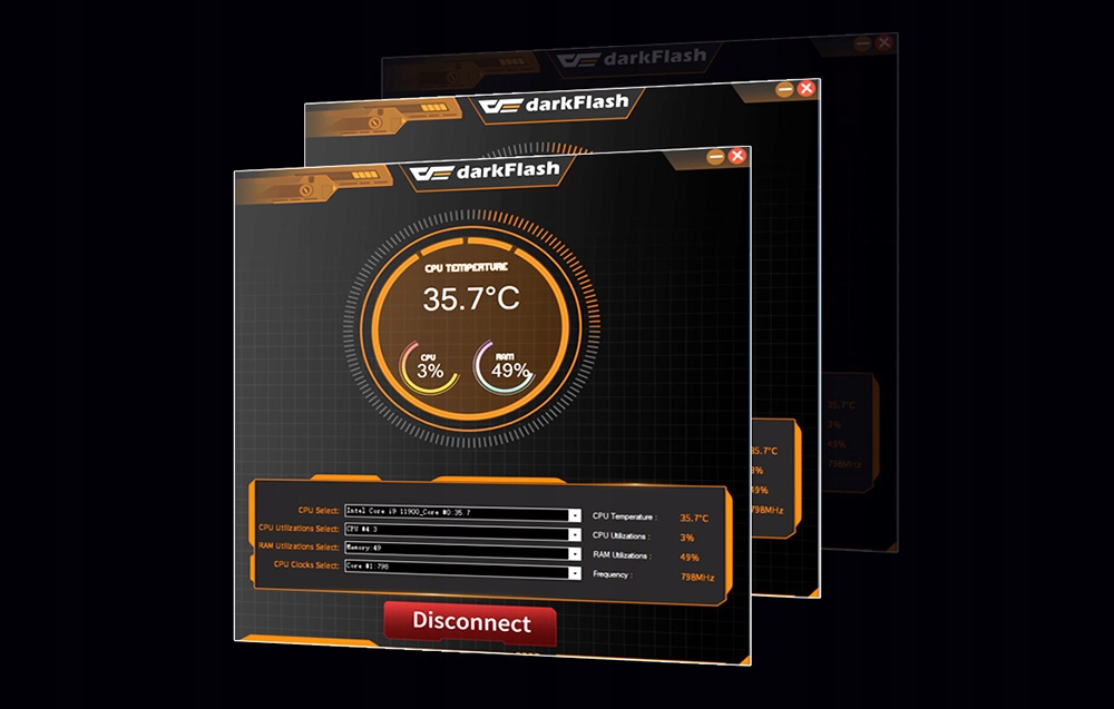 Блок води має 2,1 -дюймовий РК -дисплей, що пропонує роздільну здатність 480x480 Px та 16,7 мільйонів кольорів. Він надає інформацію про температуру процесора (процесор), швидкість оперативної пам’яті та насоса, що дозволяє контролювати параметри безпосередньо при охолодженні. Завдяки цьому ви можете легко адаптувати систему до своїх потреб. Продукт Darkflash також працює з спеціалізованим програмним забезпеченням, яке дозволяє повним контролем над налаштуваннями охолодження та моніторингу системи системи. Завдяки інтуїтивному інтерфейсу ви можете регулювати швидкість вентилятора та контролювати температуру процесора та інші компоненти.