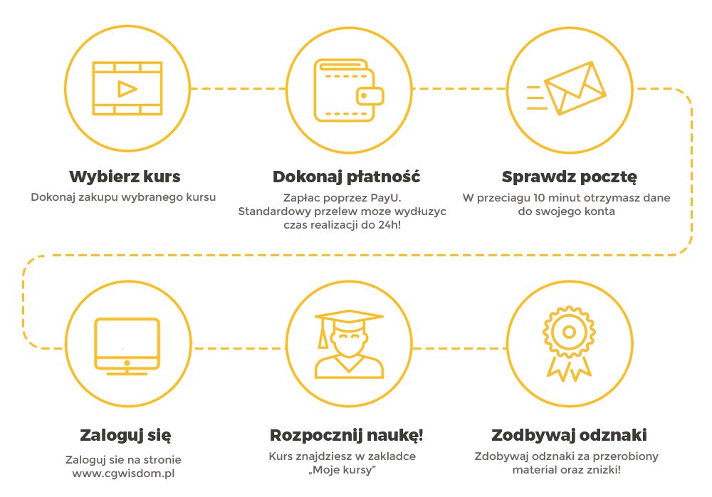 Курс доступний лише в електронному вигляді у вигляді відеофайлів. Курс можна пройти онлайн на www.cgwisdom.pl або завантажити на свій комп’ютер. Додаткову інформацію про виконання замовлень можна знайти нижче.