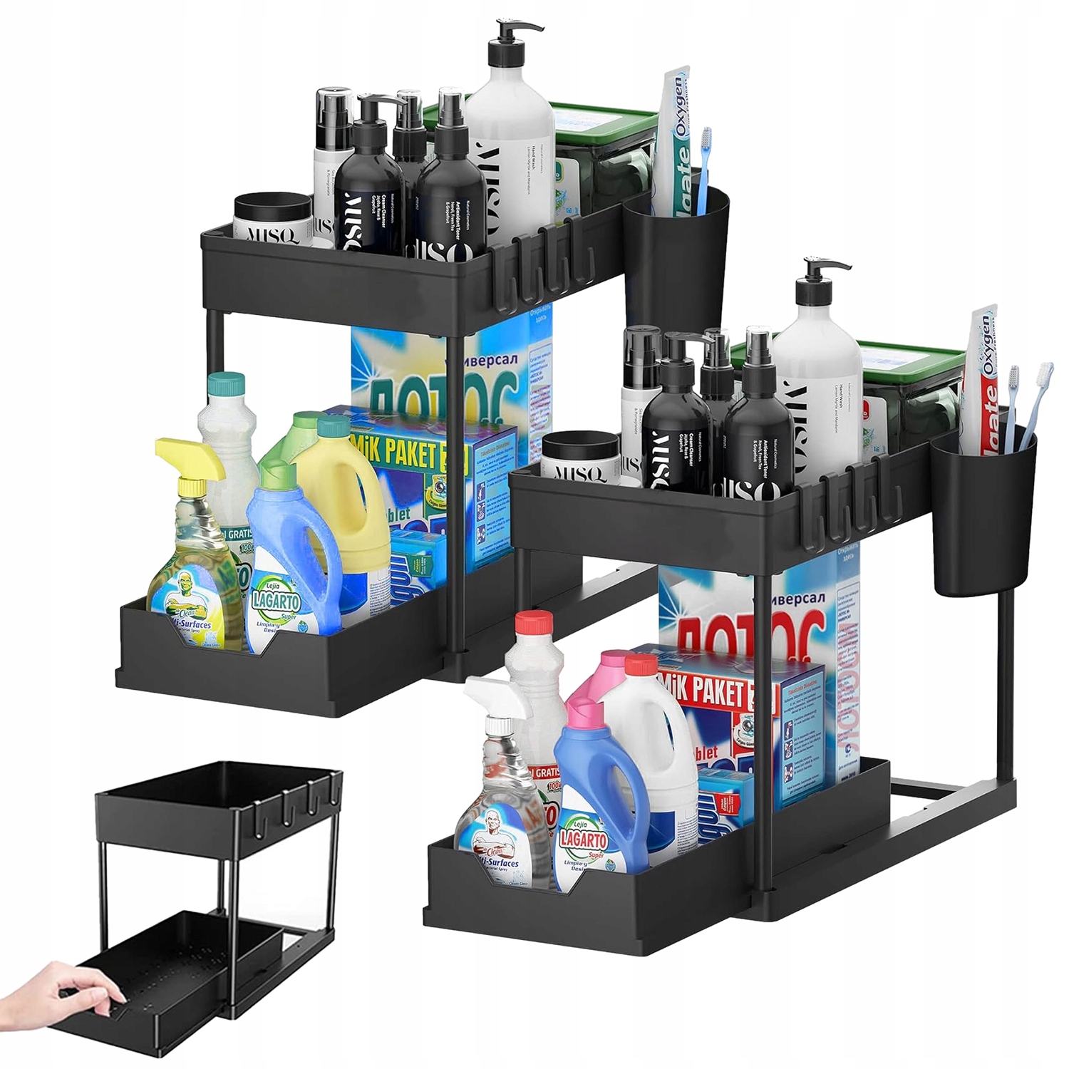 ☑️Розсувний дизайн і порожнистий дизайн:Дно нашої полиці для зберігання раковини має дизайн висувного ящика, який забезпечує легкий доступ до предметів, схованих за ним. 2-ярусні кошики з порожнистим дизайном, який має хороший дренажний ефект і не накопичує воду.