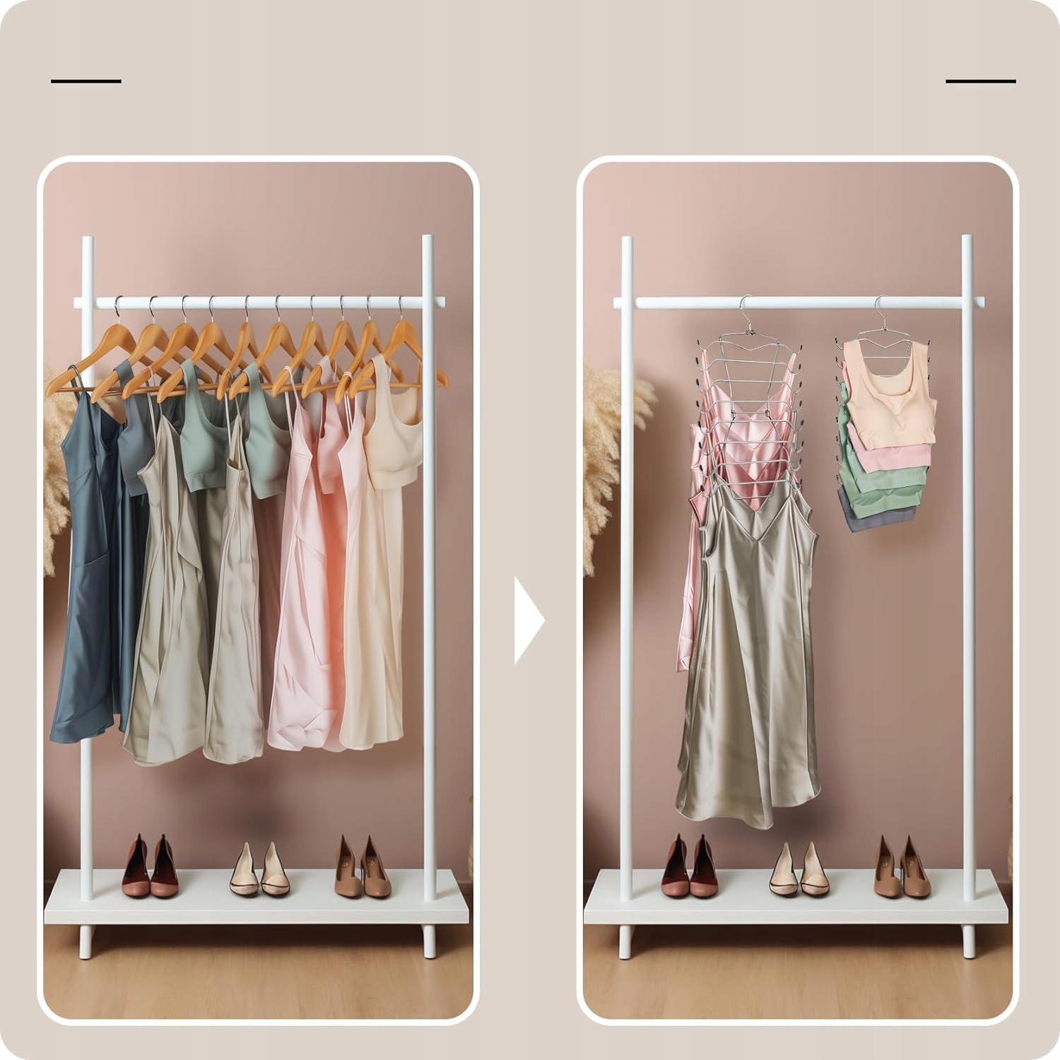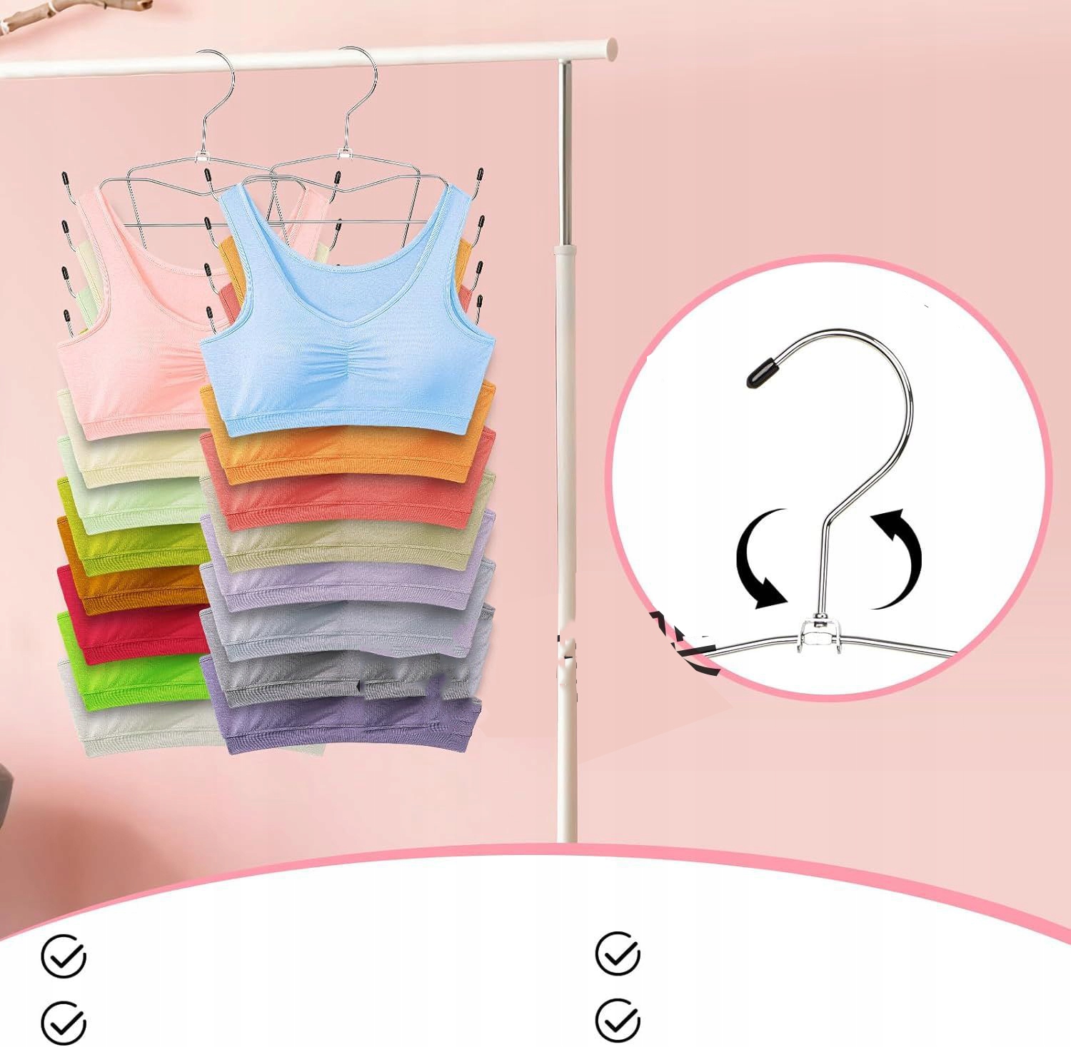 🩱 Чарівний продаж економить багато місця - у кожної вішалки є 16 гачків, тож ви можете повісити щонайменше 8 одягу. Це економить місце на барі для одягу і дозволяє повністю використовувати вертикальний простір у шафі. Краще, зберігаючи, розділене на категорії, ви можете легко переглянути всі свої жилети та бюстгальтери та знайти те, що шукаєте.