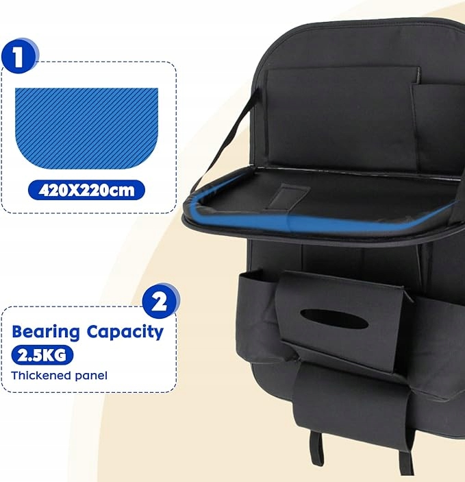 - Органайзер для автомобільного сидіння з 9 кишенями - цей органайзер для заднього сидіння автомобіля розроблений, щоб ідеально зберігати ваші речі та зберігати все організоване та просторе середовище всередині автомобіль. Включає 2 кишені для зберігання пляшок, 2 кишені для зберігання телефонів або зарядних пристроїв, 2 кишені для планшета, 3 відділення для зберігання журналів, закусок тощо. можна використовувати як обідній стіл, а також як робочий стіл для зберігання планшета. Хороший вибір для перегляду мультиків або малювання в машині. Він виготовлений з твердої дошки та витримує предмети вагою до 2,5 кг.
