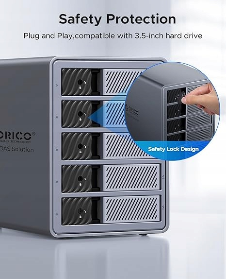 • [Захист від безпеки]: Корпус для багатьох жорстких дисків має структуру без ручок, що дозволяє швидко розбирати та збірник, а також незалежний механізм блокування, який фактично запобігає несподіваному видаленню або втраті жорсткого диска та гарантує безпеку даних.