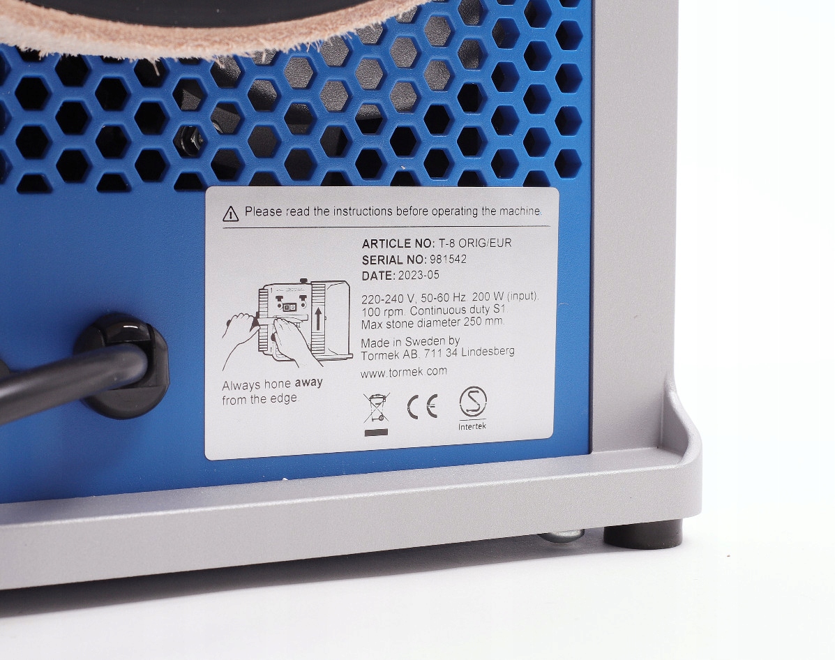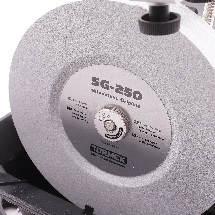 Tormek T-8 Original оснащений оригінальним шліфувальним каменем SG-250, властивості шліфування якого регулюються по зернистості в діапазоні від 220 до 1000, завдяки чому можна шліфувати всі види сталі, в тому числі HSS.